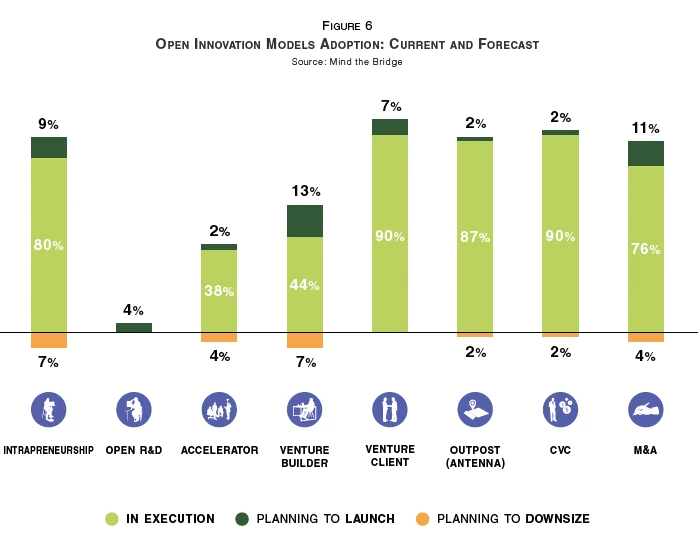 현재 기업들이 활용하는 오픈이노베이션 모델은 매우 다양하며, 상황과 목표에 따라 서로 다른 도구들을 조합하기도 합니다. Mind the Bridge 보고서에서는 기업들이 활용하는 대표적인 오픈이노베이션 수단들을 소개하고 있는데, 이를 보면 내부에서부터 외부까지 폭넓은 스펙트럼을 알 수 있습니다. 내부 혁신 촉진을 위해 사내 기업가정신 프로그램(Intrapreneurship)이나 사내 액셀러레이터(Accelerator), 스타트업 스튜디오/벤처 빌더(Venture Builder) 등을 운영하는 한편, 외부와의 접점을 늘리기 위해 글로벌 기술 허브에 거점(Outpost 또는 안테나)을 설치하거나, 스타트업을 고객 겸 파트너로서 활용하는 벤처 클라이언트(Venture Client) 모델, 기업형 벤처캐피탈(CVC) 투자, 스타트업 인수합병(M&A)까지 다양한 방식을 동원합니다. 또한 연구개발(R&D) 부문에서도 개방형 혁신 R&D(Open R&D)을 도입하여, 외부 연구기관이나 스타트업과 공동 연구를 하거나 스타트업의 린 스타트업 방식을 벤치마킹하는 경우도 늘고 있습니다. 이렇듯 하나의 정형화된 모델이 아니라 여러 도구를 목적에 맞게 병행하는 것이 오늘날 오픈 이노베이션의 특징입니다.