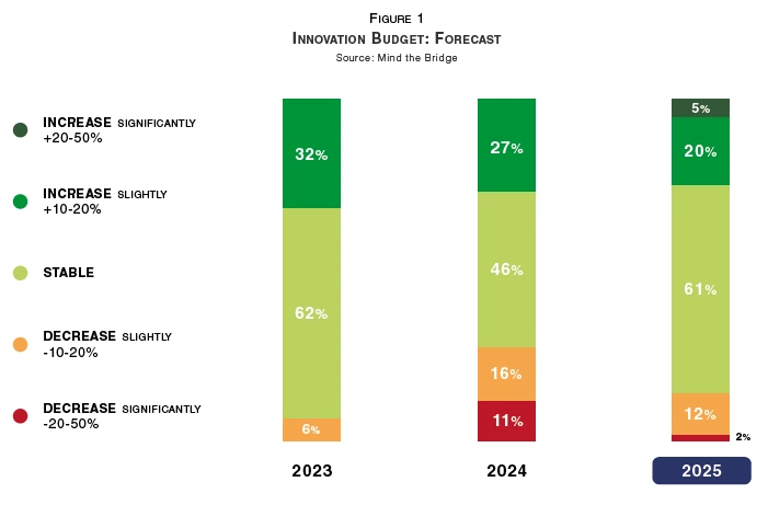 그러나 2025년을 바라보는 기업들의 예산 계획은 한층 긍정적인 방향으로 돌아서고 있습니다. Mind the Bridge 보고서에 따르면 2025년에는 86%의 기업이 오픈 이노베이션 예산을 기존 수준으로 유지하거나 확대할 전망입니다. 이 비율은 2024년에 동일 질문에 대해 응답했던 73%보다 높아진 것이며, 비록 2023년의 94%에는 아직 못 미치지만 상당히 회복된 수치입니다. 특히 4분의 1에 해당하는 25%의 기업은 혁신 예산을 늘릴 계획이라고 답했고, 그 중 5%는 예산을 크게 증액할 것이라고 밝혔습니다.
