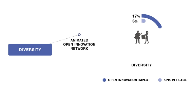 마지막으로 조직 문화 및 다양성 측면은 여전히 간과되고 있는데, 이 영역을 중요 측정 영역으로 꼽은 기업은 10%도 채 안 되었습니다. 예를 들어, 오픈이노베이션을 통해 사내 직원들의 역량이 향상되거나(업스킬링), 부서 간 협업 문화가 개선된 정도 등을 측정하는 기업은 극소수라는 것입니다.