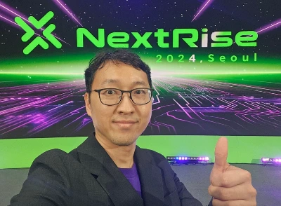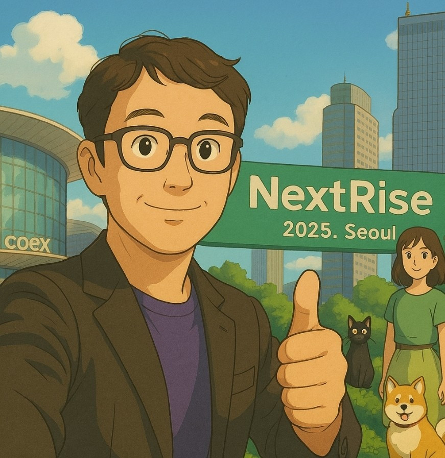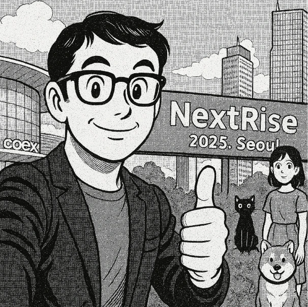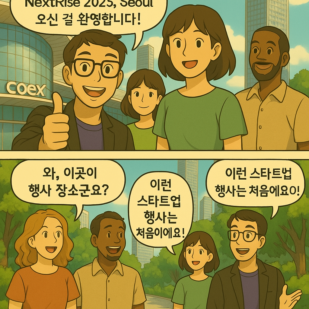 이 이미지의 사람들을 이용해 2컷 웹툰을 그려줘. 메모리 업데이트하고 사람은 모습을 다음 컷에서도 매번 동일하게 유지해줘 ### **[1컷 프롬프트]** **스타일**: Ghibli-style animated webtoon frame **등장인물**: - 남자: 검은 테일러드 재킷 + 넥라 보라색 티셔츠 착용, 안경, 밝은 미소 - 여자: 초록색 상의 + 연두색 치마, 단발머리, 부드러운 표정 - 배경: 서울 삼성동 코엑스와 트레이드타워, 여름 하늘 - 구성: 컷마다 4명 등장 — 두 한국무역협회 직원(남/여) + 백인 여성 + 흑인 남성 - 대사 포함, 웹툰 포맷(말풍선) #### **컷1** **장면**: 코엑스 입구 앞, 남자 직원이 스마트폰 셀카처럼 네 명이 함께 찍는 듯이 엄지 척 **대사** (말풍선 형식): 남직원: “안녕하세요! NextRise 2025, Seoul에 오신 걸 환영합니다!” 여자직원: “여기 코엑스에서 열려요!” #### **컷2** **장면**: 네 사람이 걷고 있으며, 백인 여성과 흑인 남성이 직원들의 설명을 듣는 모습 **대사**: 백인 여성: “와, 이곳이 행사 장소군요?” 흑인 남성: “이런 스타트업 행사는 처음이에요!” 남직원: “올해는 25,000명이 모일 예정이에요!”