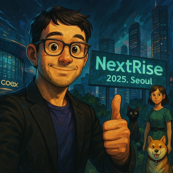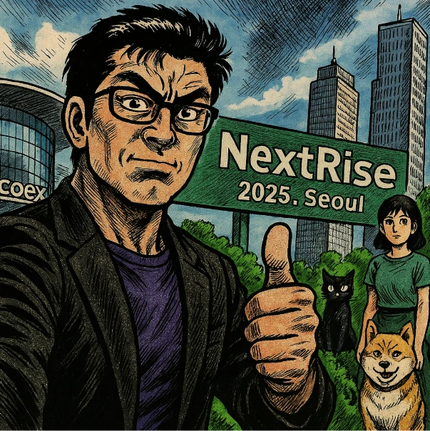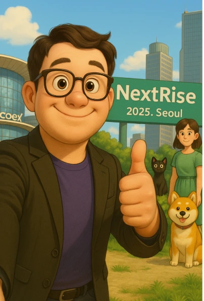 위 그림을 동일한 샘플을 바탕으로 안에 텍스트를 2025로 바꾸고, 뒤에 풍경에 코엑스와 트레이드 타워를 넣어 주고 여자 한 명(넥스트 라이즈 걸)과 고양이, 강아지를 뒤에 함께 넣어 줘.