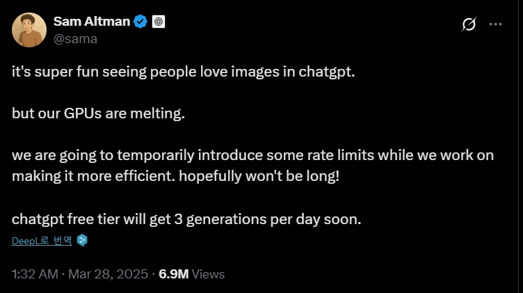 그 결과, 이용이 폭증했고, 3월 28일, 샘 알트만은, 전세계 사람들이 너무나 그림 그리기를 사랑한 나머지, 우리 GPU가 녹아내리고 있어!..라고 선언하며 살짝 제동을 걸 거라고 얘기합니다. 말은 그렇지만, 즐거운 엄살로 보입니다.