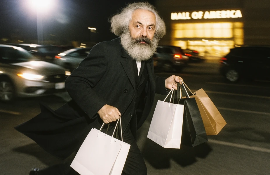 A candid paparazzi-style photo of Karl Marx hurriedly walking through the parking lot of the Mall of America, glancing over his shoulder with a startled expression as he tries to avoid being photographed. He’s clutching multiple glossy shopping bags filled with luxury goods. His coat flutters behind him in the wind, and one of the bags is swinging as if he’s mid-stride. Blurred background with cars and a glowing mall entrance to emphasize motion. Flash glare from the camera partially overexposes the image, giving it a chaotic, tabloid feel.