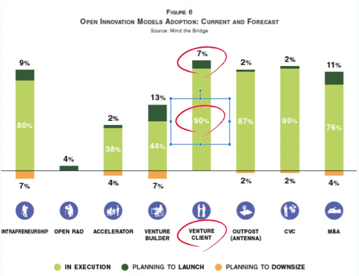 새삼스럽게 왜 주목 받느냐? 그 배경에는 최근의 벤처 불황과 오픈이노베이션 춘곤기가 있습니다. 특히 2025년은, 한국이든 해외든, 대중견기업의 혁신조직들에 생존을 증명할 혹독한 시기입니다. 제가 앞서 소개했던 MTB의 2025년 오픈이노베이션 리포트에서, 그와 같은 이유로, 많은 벤처링 수단들이 효율성 중심으로 재편되고 있고, 벤처클라이언트가 좀더 부각되고 있다는 점을 소개한 바 있었지요. 즉, 어렵게 씨 뿌리고 오래 육성해야 하는 수단들보다, 안타깝지만, 몇 번 실험하면 바로 플러그인 가능한 툴들, 보다 적은 리스크 대비 가성비가 좋은 벤처클라이언트가 좀더 각광받고 있는 셈이죠.