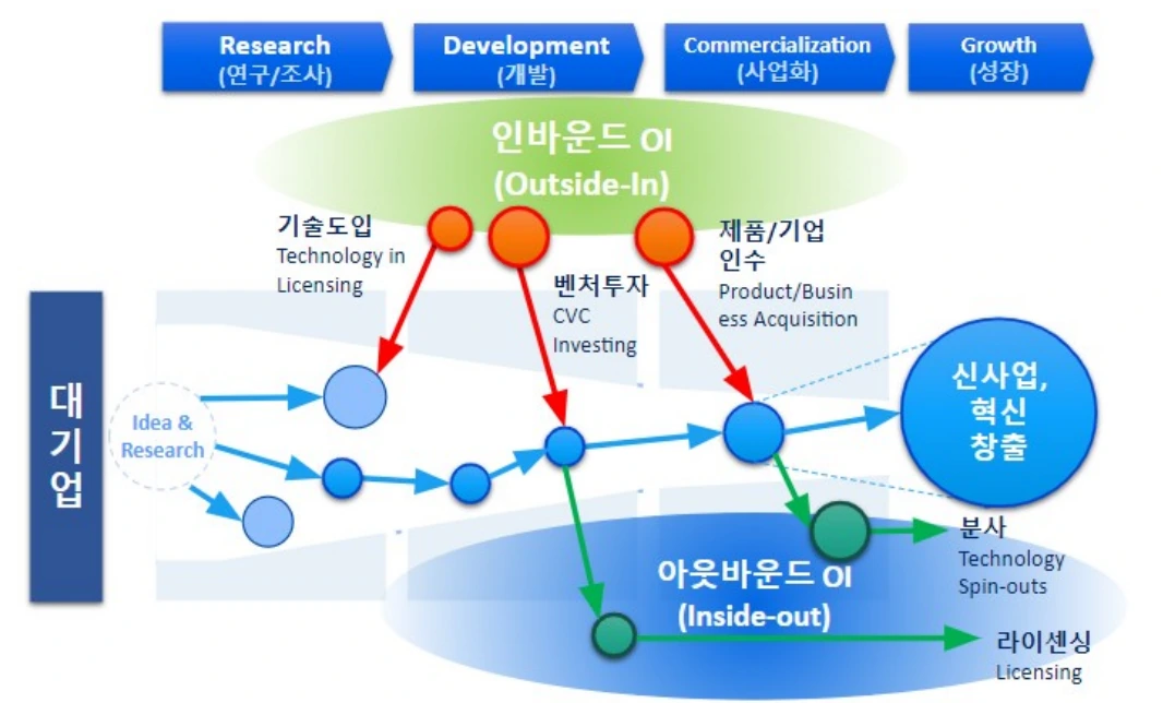 오픈이노베이션은 이상이 아니라 전략적 경영체계인 셈이죠. 흔히, "변화관리" 전략이라고도 합니다. 이 철학은 오늘날의 CVC(Corporate Venture Capital), PoC(Proof of Concept), Co-Creation(공동개발), JV(합작법인) 모델의 근간이 되었습니다.