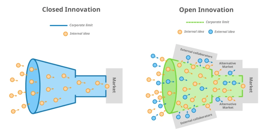 개방형 혁신의 깔때기 모델: 왼쪽은 폐쇄형 혁신(아이디어가 내부에서만 생성·선별됨), 오른쪽은 개방형 혁신(외부에서 아이디어 유입, 내부 아이디어도 외부로 유출) 모델을 보여줍니다. 체스브로는 이처럼 경계가 반투과성인 조직만이 현대 환경에서 혁신을 선도한다고 보았죠.
