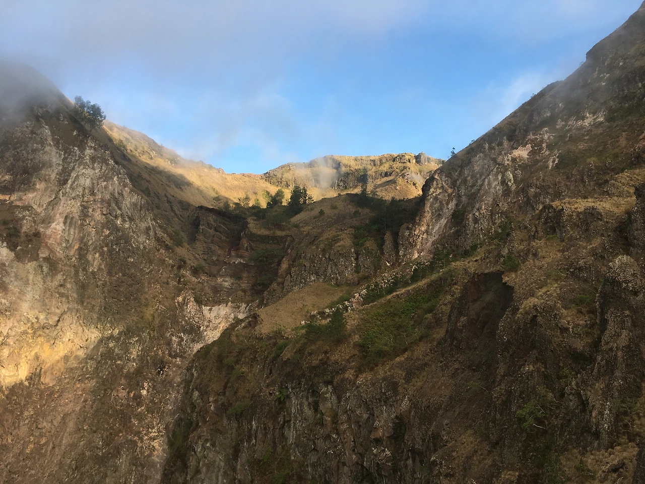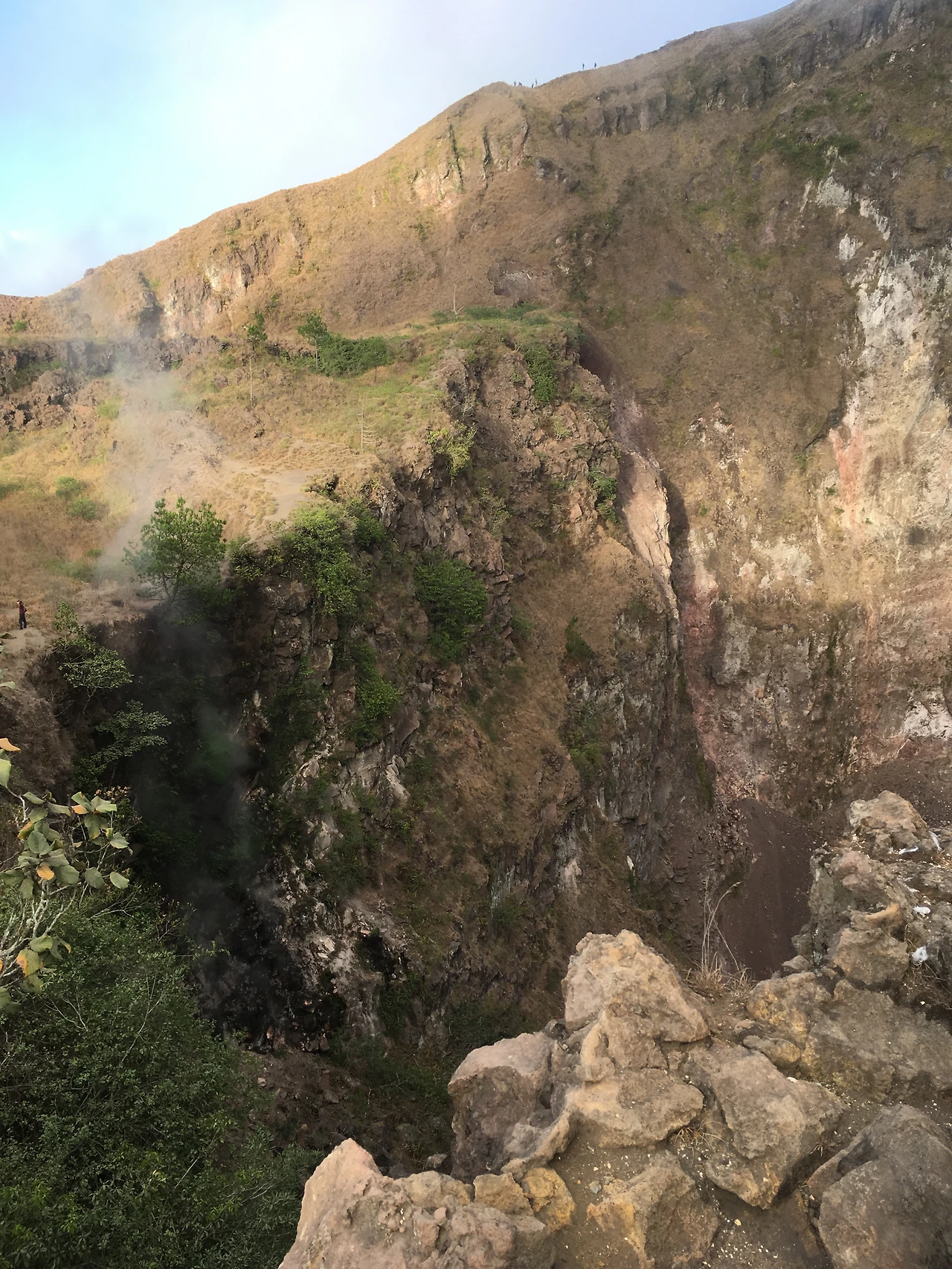 중간중간에 가이드 분이 특징적인 화산지형 곳곳을 안내해주어서 신기한 것을 많이 보았습니다. 뜨거운 증기가 나오는 분기공을 발견할 때면 후후 불고 훅 올라오는 증기에 아이처럼 박수를 치고 좋아했습니다. 어두울 때 올라와서 잘 몰랐는데, 내려오면서 보니 산세가 정말 웅장했습니다. 2000년에 용암이 분출되고 현재는 안에서만 끓고 있다는 거대한 화구는 어찌나 넓고 깊은지 나무가 풀처럼 대롱대롱 매달려 자라고 있고 증기가 올라오는 바닥은 끝까지 들여다보기도 어려웠습니다. 다들 길게 목을 빼고 여러 각도에서 빼꼼히 들여다 보고들 있는데 가이드분이 일전에 누가 셀카를 찍다가 떨어져서 죽었다며 조심할 것을 당부했습니다. 찾아보니 정말 안타깝게도 2010년에 스물다섯 살의 스웨덴 청년이 이곳에서 죽었다는 기사가 나왔습니다.