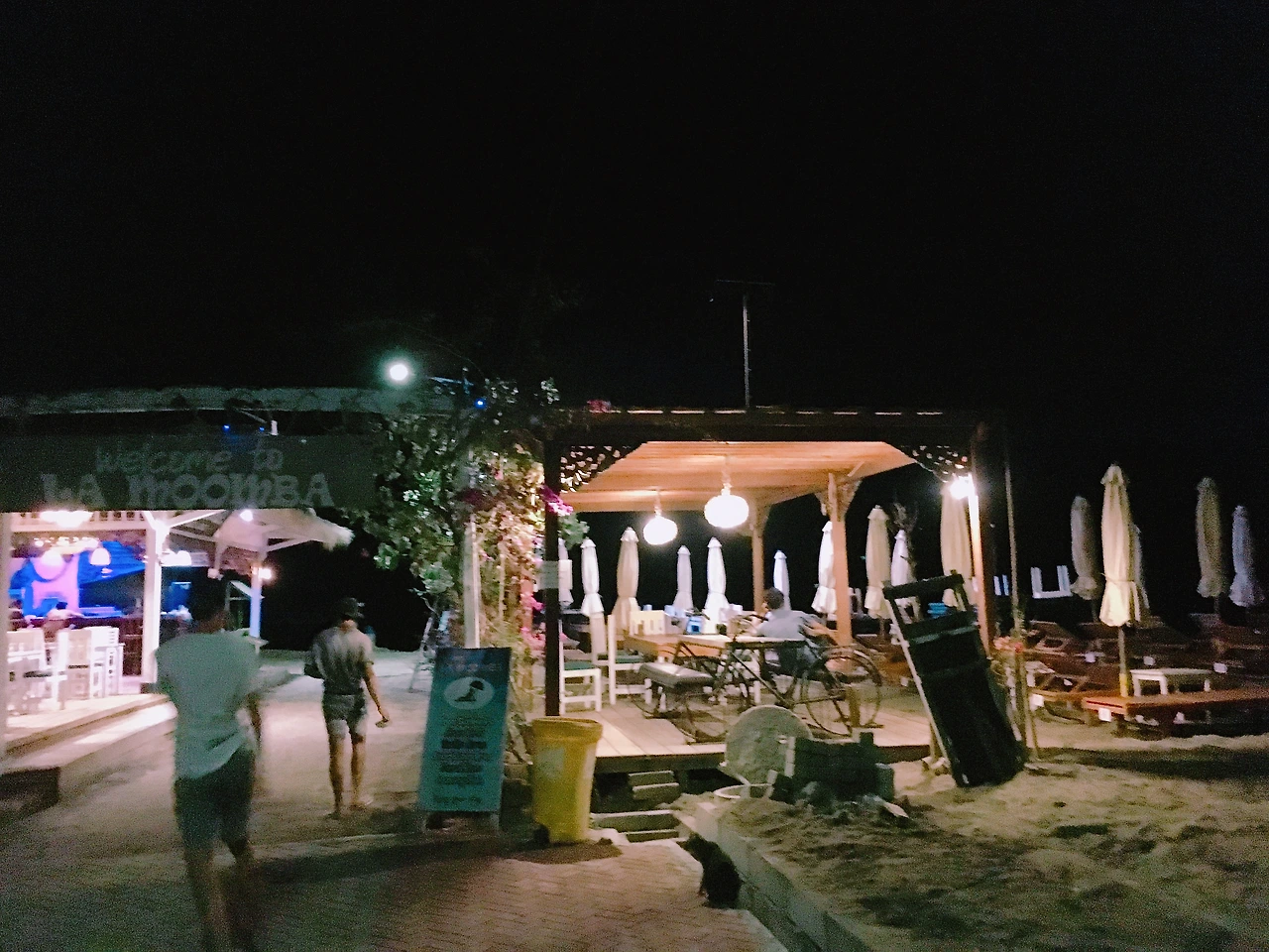 선착장에서 오른쪽으로 상점의 행렬의 가장 끝집까지 가서 자리를 잡았습니다. 어둠이 내리고, 맥주를 마시다가 바로 바다로 걸어 들어가 달빛 아래서 바다 수영을 할 수 있는 곳이었습니다.