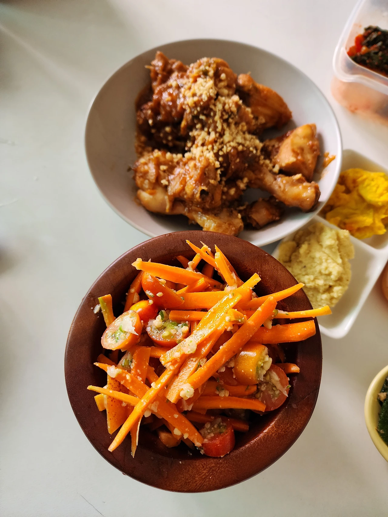 집으로 돌아와 텃밭에서 수확한 미니당근과 방울토마토로 태국식 샐러드 ‘쏨땀’을 만들었다.