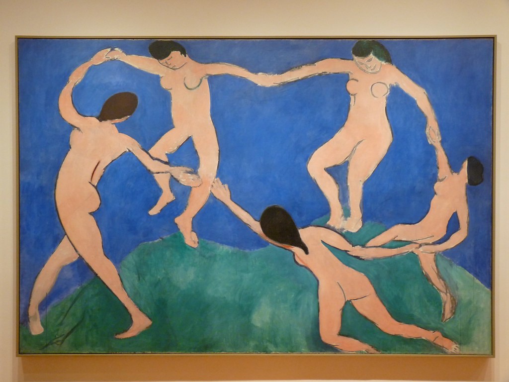 (4절지로 가정) 4절지를 가로로 활용해 전체를 빈틈없이 물감으로 100% 채색함. 5명의 나체의 사람들이 서로 손을 잡고 강강술래 하듯 돌고 있는 모습을 밑그림 표현 후 살구톤으로 피부를 채색함. 이후 검은색으로 테두리를 비교적 일관된 선의 굵기를 가지나 팔을 맞잡는 부분이나 다리 부분에서 강조되거나 여러 번 덧칠함. 화지 하단의 1/3은 청록색으로 언덕 형태를 그리고, 위쪽의 2/3 공간은 파란색으로 빈틈없이 채색함. 정면을 바라보는 사람 2명은 모두 고개를 숙이고 무릎이 구부러진 채 춤을 추고 있는 듯하며, 한 명은 무표정, 한 명은 웃는 표정으로 그려짐. 가장 우측의 사람은 옆모습으로 다리 외곽선을 흐리게 여러 번 덧칠함. 아래쪽의 인물 2명은 손을 놓친 상태로 뒷모습으로 표현함.