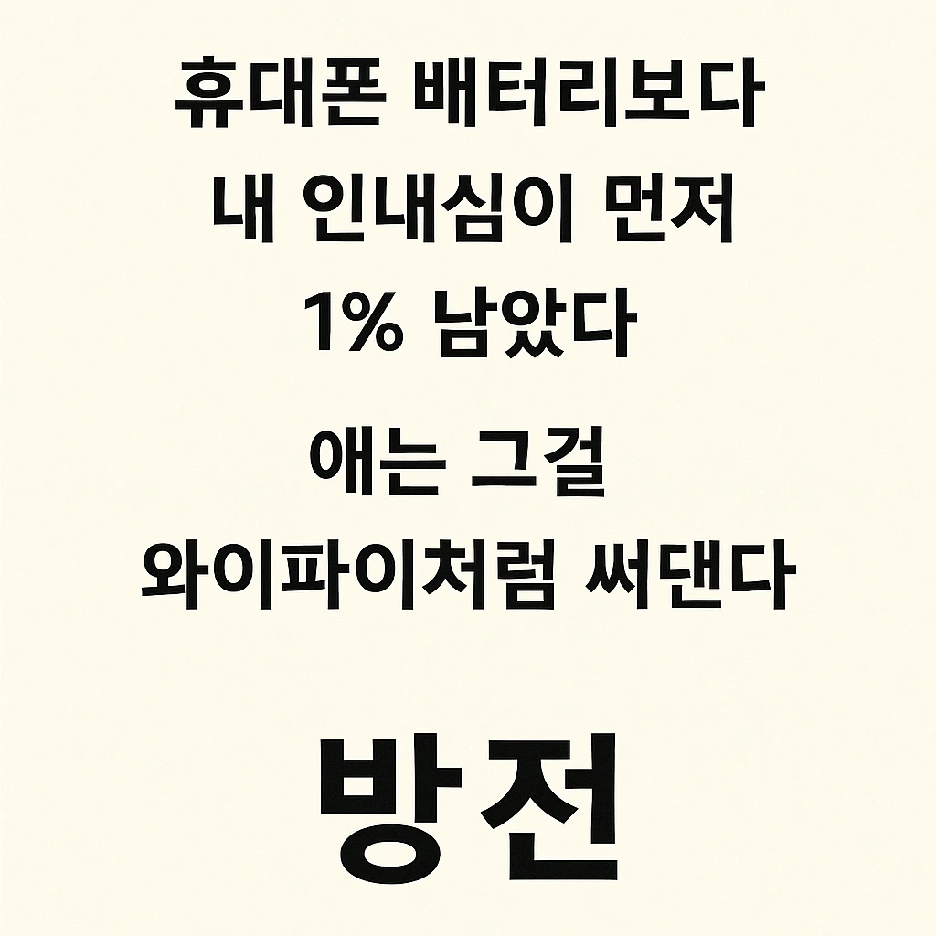 휴대폰은 아직 12% 남았는데내 인내심은 방금 0% 됐다.애는 그걸 모른다.와이파이 연결하듯 계속 쓴다.나는 지금, 절전모드도 없다.