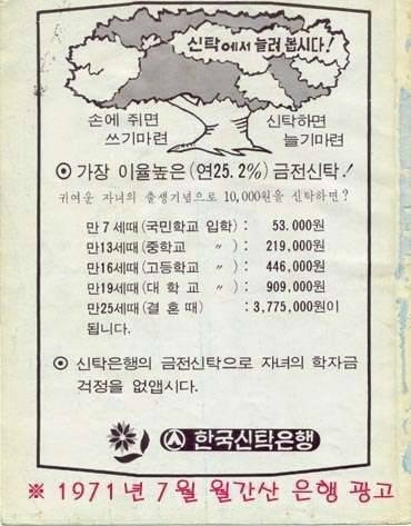 1971년 서울신탁은행(현재 하나은행) 예금 이자는 25.2% 였습니다. 당시 1천만 원을 저축했다면 252만 원을 이자로 받을 수 있었네요. 그러니 저축만 잘하면 부자가 될 수 있는 시기였습니다. 이 당시에 저축의 힘을 몸소 느낀 우리의 부모님 세대가 우리에게 계속 저축을 강조하는 이유이기도 하지요.