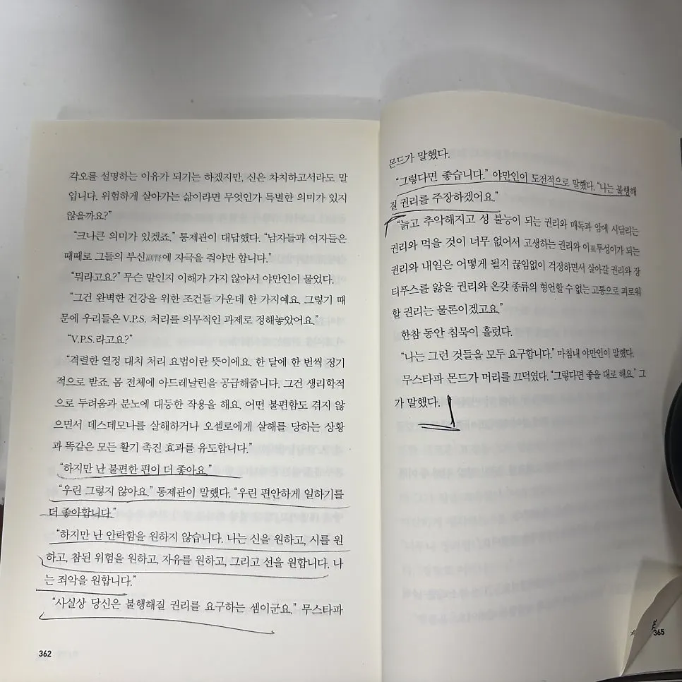 내가 볼 때 이 책은 현시대를 관통한다. 모든 이가 안정과 쾌락을 좇는다. 마치 그것이 인간의 궁극적 이상향인 것처럼 말이다. 모든 이가 어떠한 불편도 겪으려 하지 않으며 어떠한 피해도 보기 싫어하며 어떠한 추잡함도 원하지 않는다. 그러나 사실 그것은 원함일 뿐 현실은 매일 마주해야만 한다.