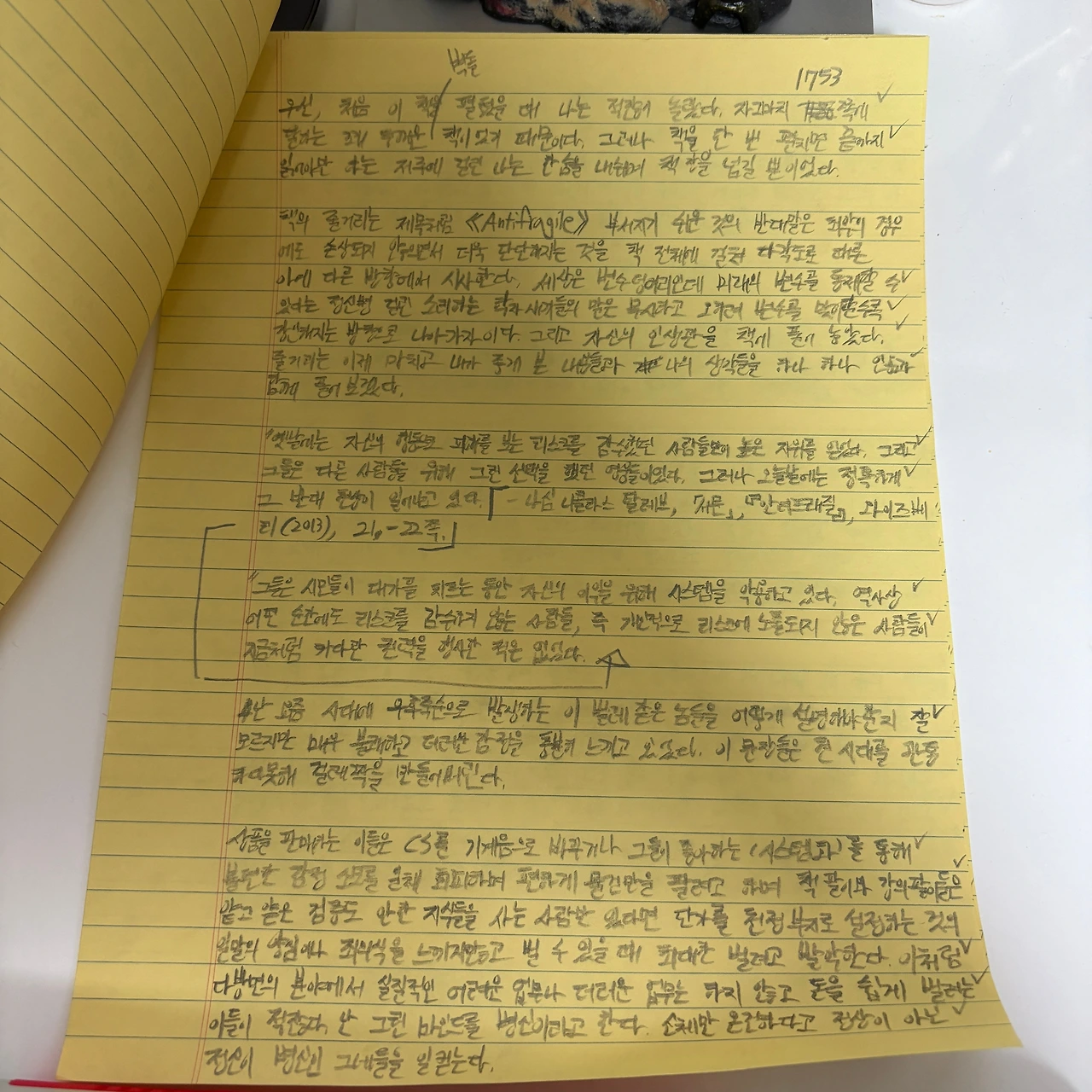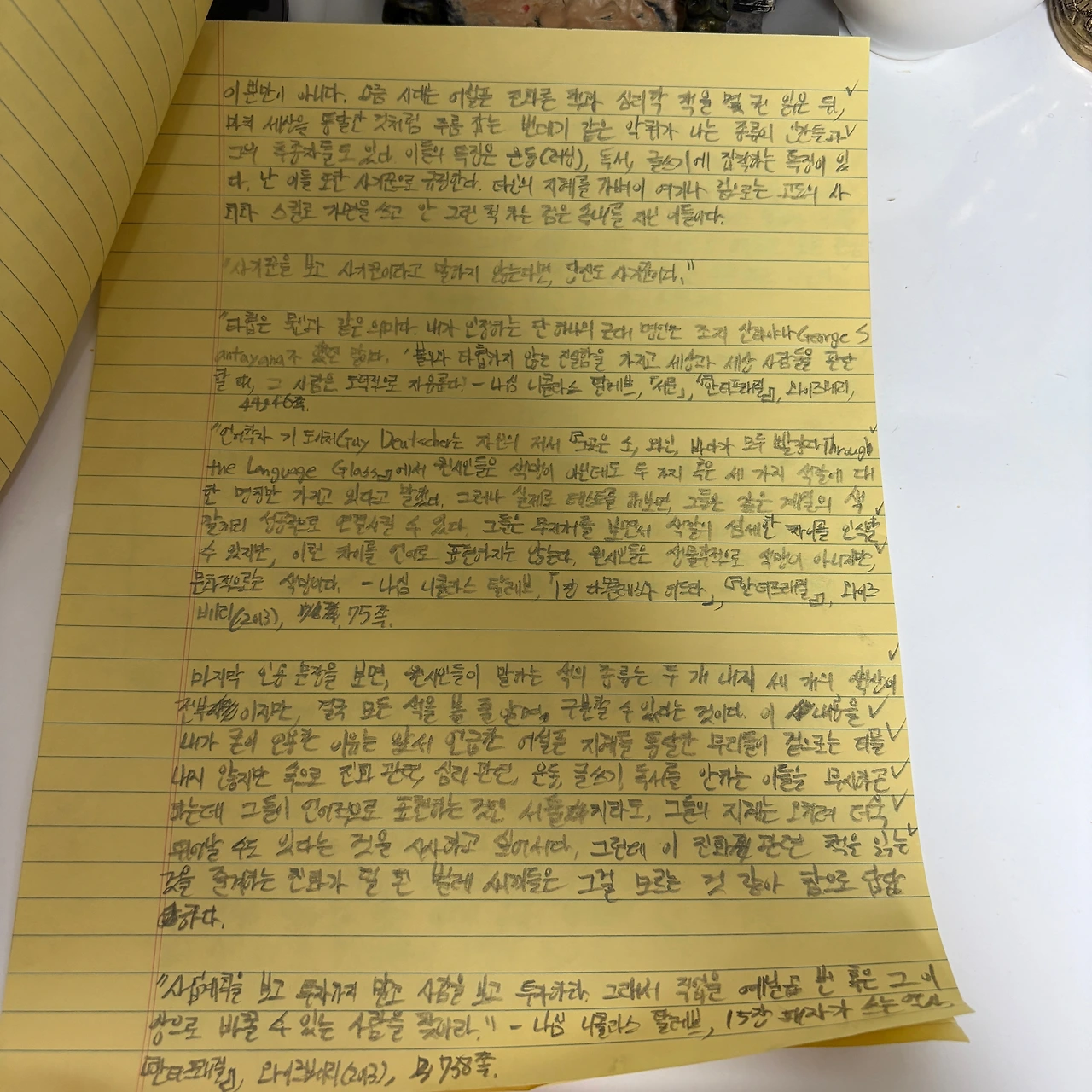 "오랜 고민 끝에 여과되어 나오는 아이디어만이 받아들여질 만하다. 그리고 이런 아이디어는 도서관이 아니라 현실에서 나온다." - 나심 니콜라스 탈레브, 「서문」, 『안티프래질』 , 와이즈베리(2013), 44쪽.