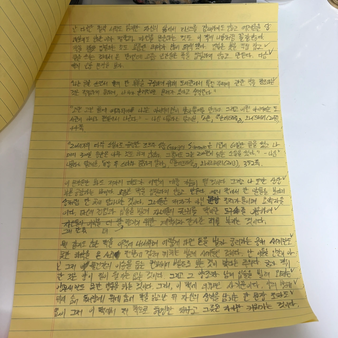 "나는 글을 쓰면서 글의 한 부분을 구성하기 위해 도서관에서 특정 주제에 관한 책을 참조하는 것은 적절하지 못하며, 나아가 윤리적으로 문제가 있다고 생각한다"