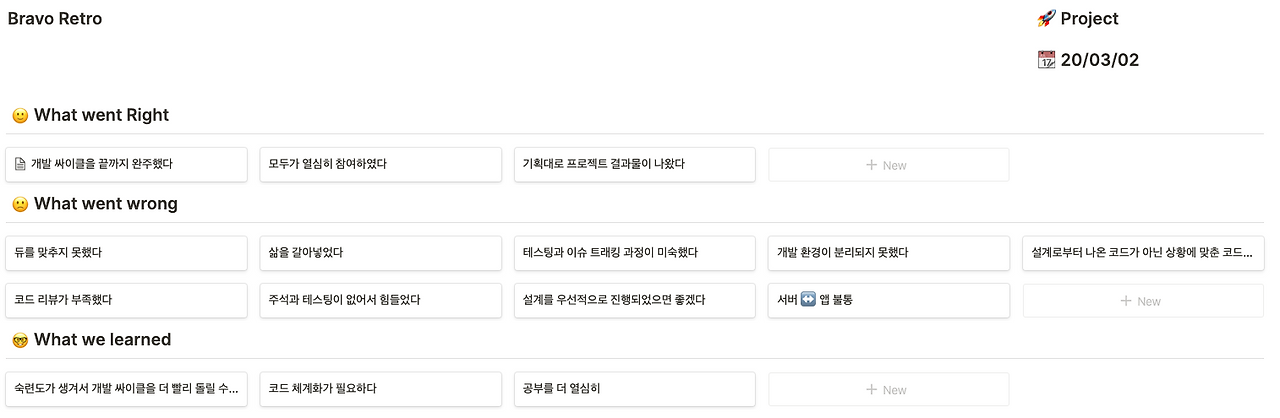 우리는 우리의 일하는 방식을 바꾸기 전에 우리의 현 상태를 알아야만 했다. 무엇이 문제이고 어떤 점이 우리를 엉망진창으로 만들었는지 알아내야 했다. 그래서 우리는 자체적으로 Retro(Retrospective, 회고)를 진행하였다. 우리는 자체 회고를 통해 무엇이 좋았고, 어떤 점이 좋지 않았으며, 어떤 점을 배웠나에 대한 생각을 서로 나누기 시작했다.