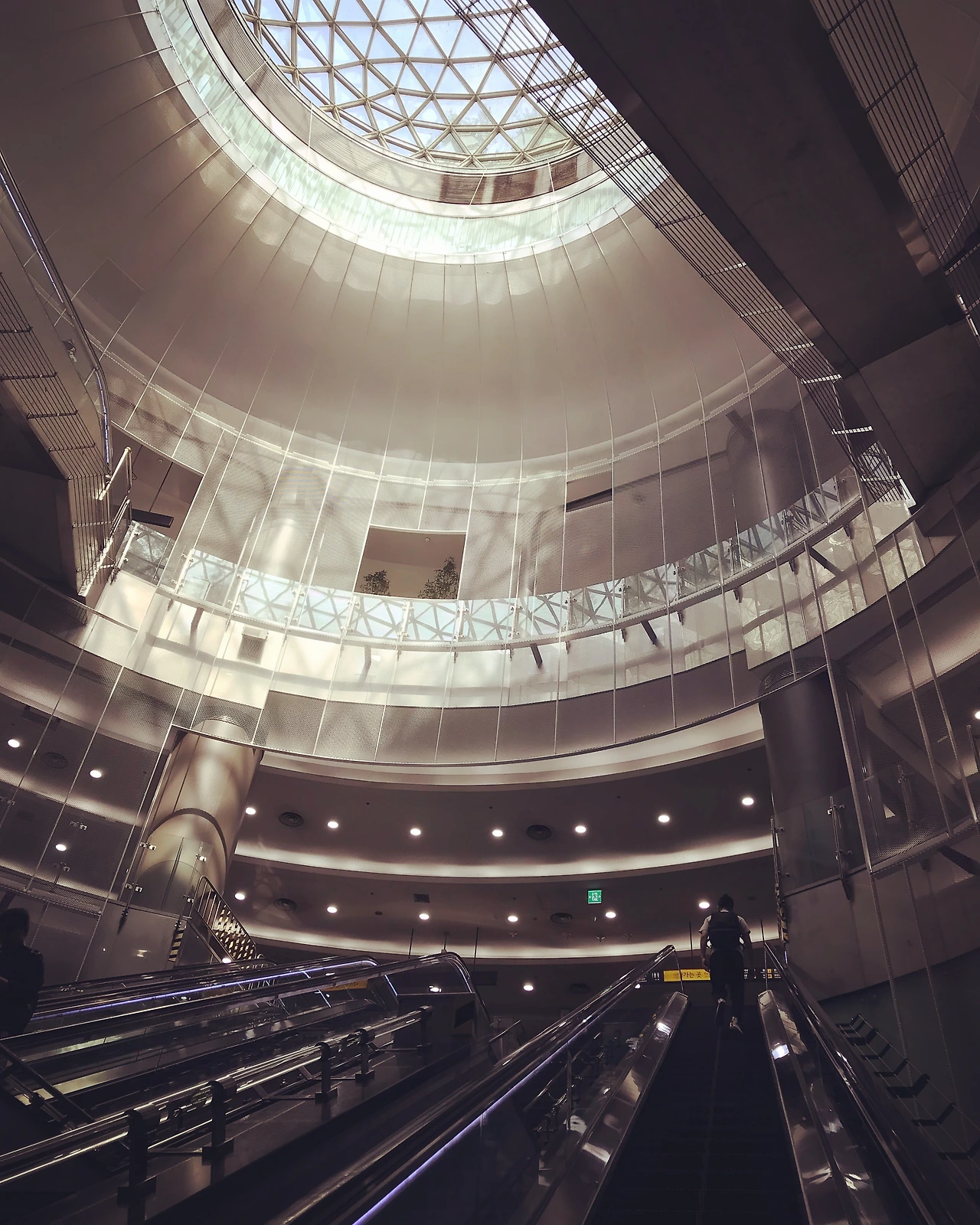 큰 돔 형태의 천정을 지붕으로 그 아래 깊고 길게 수직동굴처럼 뻗은 공간 아래로 사람들이 오르내릴 수 있는 계단과 에스컬레이터들이 멋지게 얽혀있다. 맨 아래 바닥에 위치한 개찰구 입구 뒤편으로는 수많은 나무 기둥들이 마치 숲처럼 세워져 있는 설치 작품까지 어우러져 다른 역에서는 찾아보기 힘든 인상적인 매력이 있는 곳이다.