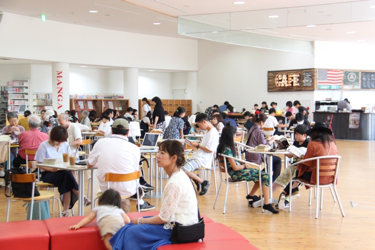 '북카페'를 콘셉트로, 도서관 기능을 하면서도 편하게 대화도 할 수 있고, 카페 안에서 구입한 음식도 먹을 수 있는 공간. 전국적으로 드문 스타일의 공간이 만들어졌습니다. 소장하고 있는 약 8만 권의 책 중 절반은 일반서적, 절반은 만화 잡지와 같은 캐주얼한 책들입니다. 원하는 주민들이 오픈 테라스에 나가서 바깥 공기나 햇빛을 쬐면서 독서를 할 수 있도록 도난 방지 게이트도 설치하지 않았습니다. 실제로 도난 피해도 거의 일어나지 않는다고 합니다.