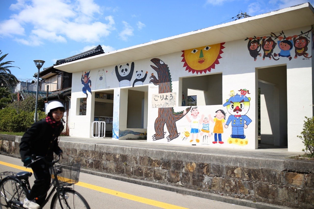 2017년에는 그림책 전시 판매회 <그림책 월드>가 시작되었고 운행을 중지한 아리타 철도선의 자취를 살려 <칙칙폭폭 길 (폿포-미치)> 옆에 있는 벽을 캔버스로 활용한 아홉 명의 그림책 작가의 라이브 페인팅 이벤트도 진행되었습니다. 덕분에 마을은 모두 그림책으로 뒤덮이게 되었습니다.