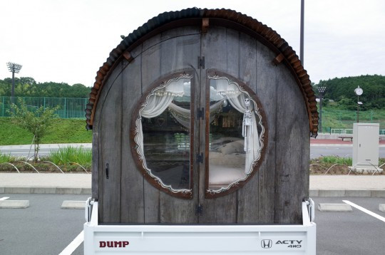 텟페이씨는 어스 백 하우스를 만드는 수행을 할 때 경화물차 뒤에 작은 집을 만들어 살았다고 합니다. 그것을 본 쥰코 씨는 "이거 갖고 싶다!"며 첫 눈에 반했다고. 치바현 소사시에서 어스 백 하우스를 지은 동료 나리카와 켄이치 씨도 도우러 와주어서, 직접 만든 경화물차 모바일 하우스에 탈 수 있게 되었습니다.