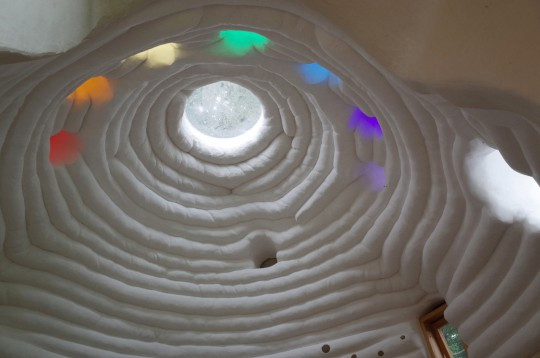 '어스 백'은 흙을 자루에 담은 「흙포대자루」를 말합니다. 석회를 섞은 흙을 자루에 채우고, 두드리고 다지면서 돔처럼 쌓아가는 건축 방법입니다. 기둥이나 대들보 등을 사용하지 않기 때문에 곡선 등 디자인을 자유롭게 할 수 있는 장점이 있어서 주목 받고 있습니다.
