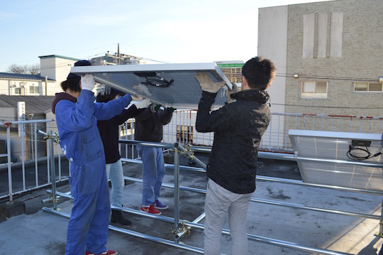 설치 완료 후 성취감에 가득 찬 표정들. 우여곡절을 거쳐 드디어 이 날이 맞이한 오자와 씨도 안도의 미소를 보입니다. 태양 전지 패널의 온기를 확인하듯 소중히 만지고 있는 모습이 인상적입니다.