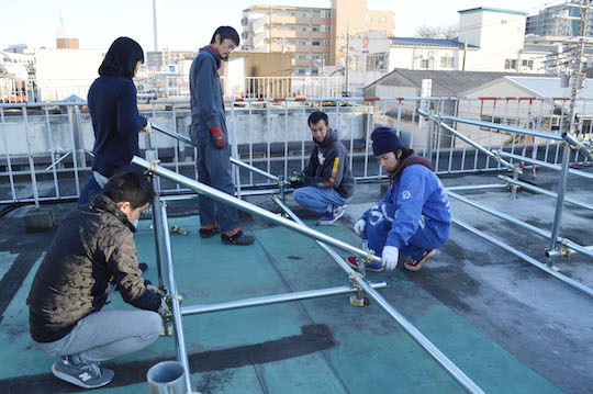 제가 도착했을 때, 옥상에서 후지노전력의 스즈키 슌타로 씨 감독 하에 작업이 이루어지고 있었습니다. 먼저 태양광 패널을 설치하기 위한 토대를 파이프 관으로 조립합니다.