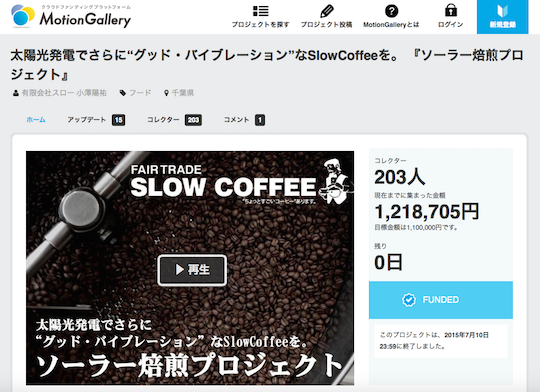 태양 로스팅 시스템을 도입함에 있어 예산의 규모가 커져서 MotionGallery을 이용해 크라우드 펀딩을 모집했습니다. 2015년 5월에 시작한 크라우드 펀딩은 7월까지 목표 금액 1,100,000 엔을 크게 웃도는 1,218,705 엔을 모으는 데 성공했습니다.