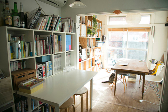 거실은 하루 동안 제가 주로 지내고 있는 설계 사무소 <Studio Tokyo West>의 사무실로도 사용합니다. <Studio Tokyo West>는 <무사시사카이 안모나이트>의 거주인 5명으로 시작한 설계 사무소이에요.