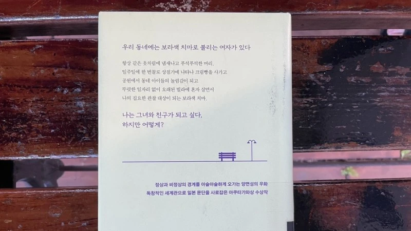 보라색 치마를 입고 동네 여기저기에 자주 출몰하는 여자를 따라다니는 소설. 마을에서 누구나 알고 있는 그 여자를 아무도 모르게 응원하는 한 사람이 있다는 것은 그녀의 삶을 다른 방향으로 이끈다. 보라색 치마는 혼자 있는 걸 좋아하는 것처럼 보이지만 실상은 아이들을 좋아하고 생각보다는 평범한 여자라고 생각했었다. 우리는 비범함을 뛰어넘는 평범함에 끌리는 걸까요.
