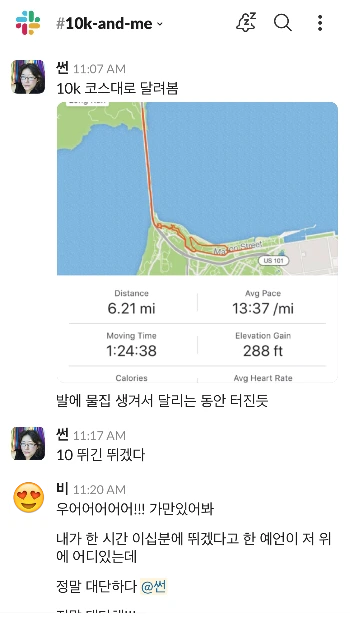 그런데 계속해서 모두가 다 일주일에 한번 글을 쓰는 것만이 상뽐회의 효능(?)이 아니었다. 나는 작년 퍼스널 플래닝 워크샵을 하면서 올해 목표중에 하나에 5K를 두 번 뛴다는 (3월에 한번 6월에 한번?) 목표를 잡았지만 과연 내가 할까 하고 반신반의 하고 있었다. 십대때도 체력장 오래달리기는 그냥 포기하던 내가 40대가 되어서 과연 얼마나 달리겠냐고… 그러던 차에 친구 김뫄뫄님이 금문교를 넘어갔다 오는 아름다운 코스의 Levi’s Presidio 10K에 대한 본인의 인상깊은 스토리를 들려주어 나를 낚는 바람에 4월 14일 레이스에 덜컥 사인업을 해버린 것은 아직 5K도 뛰기 전인 3월 초. 그때 나는 2주 뒤의 5K 레이스를 어떻게 뛸거나 엄청 걱정 하고 있었는데 10K를 사인업하자 그 걱정이 더 커서 5K는 걱정도 안되는 상황이 발생했다. 이 미친 짓(?)을 당장 상뽐회에 보고하고 “10k-and-me”라는 챗방을 팠다.