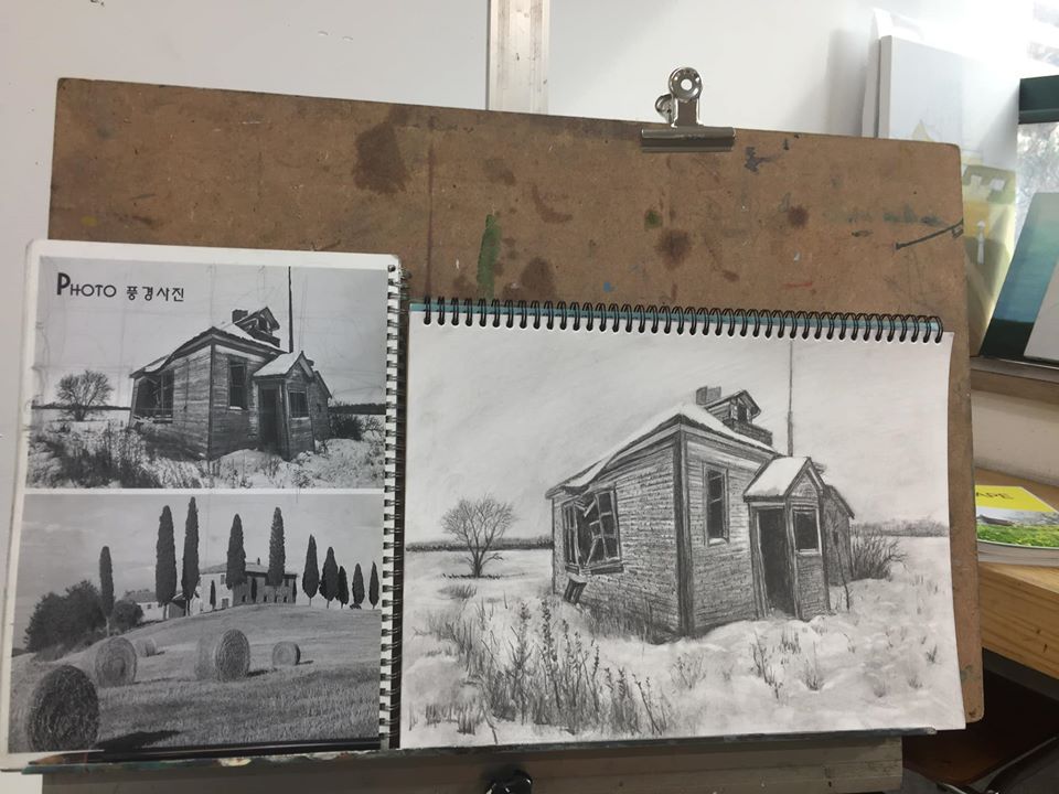 허허벌판에 다 쓰러져가는 폐가를 찍은 흑백 사진 한장을 골라 이젤 앞에 앉았습니다. 그런데 이젤앞에 앉아서 그림을 그리려고 보니 뭔가 불편했습니다. 지금까지 그림을 그리던 저의 자세가 이젤에 맞지 않았던 겁니다. 어려서부터 미술지도를 받아 이젤에 익숙한 사람들은 팔꿈치 관절을 축으로 팔 전체를 사용하여 그림을 그립니다. 그러나 저는 필기할때 펜을 잡는 방식대로 연필을 잡고 손목을 사용해 그림을 그려왔습니다. 당연히 곧은 자세로 앉아 도화지를 정면으로 봐야하는 이젤이 맞지 않았겠죠.