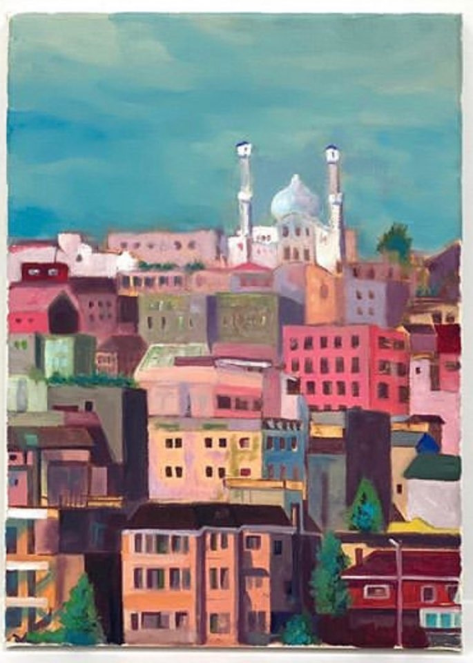 한광교회쪽은 조금 더 한국적이다. 주택 하나하나를 보고 그린다기 보다 적벽돌 일색인 주택가를 덩어리로 보고 느낌을 표현한다는 생각으로 그렸다. 이 장면은 8월 한여름에 찍은 사진을 기초로 그렸다. 창문을 흘러내리는 느낌으로 그리려고 했고 전체적으로 밝지만 우울한 분위기를 내고 싶었다. 이슬람 사원과는 확연히 다른 계절감과 분위기를 느낄 수 있다. 교회와 모스크를 한 프레임에 놓고 그릴 궁리를 하고 있다.