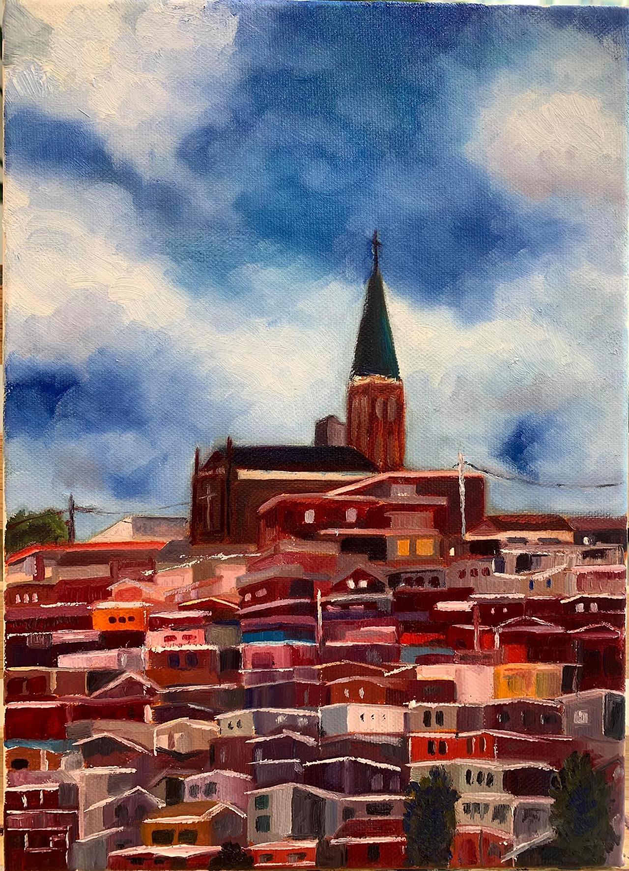 이슬람성원은 화창헀던 4월 찍은 사진을 기초로 그렸다. 육교에서 바라본 풍경을 세로 프레임으로 잘랐고 하필 신축빌라가 많은 지역이라 익숙하지 않은 세부묘사에 애를 먹었다. 근경과 원경의 터치를 다르게 하려 노력했고 하늘과 맞닿은 부분은 애써 묘사를 하기 보다 느낌만 주려고 했다. 파스텔톤 하늘이 썩 매력있다는 평을 받은 그림이다.