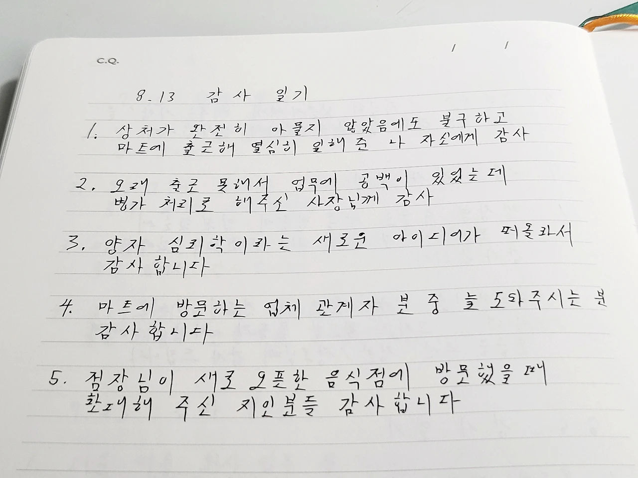 마지막으로, 점장님의 새로 오픈한 음식점에 아내와 함께 방문했을 때, 마트 관계자분들의 따뜻한 환대에 감사합니다. 그 자리에서 아내의 빛나는 미소와 행복한 표정을 볼 수 있었던 것, 그것이 저에게 주어진 오늘의 가장 큰 선물이었습니다.