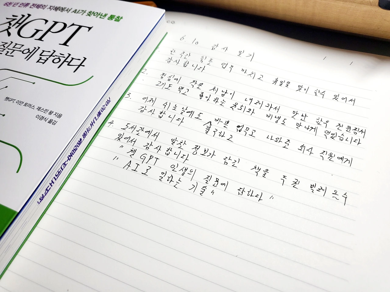 또한, 도서관에서 대여한 두 권의 책인 "챗 GPT 인생의 질문에 답하다"는 특별한 독서 경험을 제공해 주었습니다. 이 책은 챗 GPT가 인간의 질문에 대답하는 과정에서 생겨난 인사이트와 인생의 지혜를 담고 있습니다. 챗 GPT가 인간의 관점에서 세계를 바라보며 주어진 질문에 대답하는 과정에서 우리 자신에 대한 깨달음과 인생의 진실을 발견할 수 있었습니다. 이 책을 읽으면서 자신의 삶에 대한 심층적인 질문을 던지고, 새로운 관점과 아이디어를 얻을 수 있을 것 같습니다