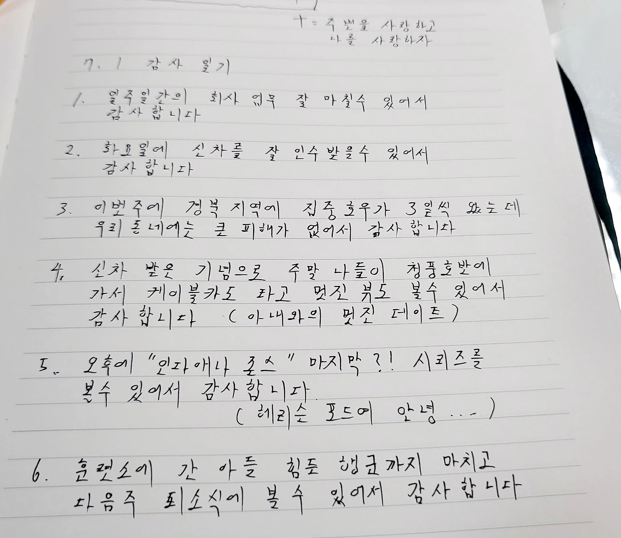 6. 그리고 가장 큰 감사와 기대를 담아 훈련소에 간 아들을 생각합니다. 그의 힘들고 힘찬 훈련을 마치고 다음 주 퇴소식 때 볼 수 있다는 사실에 큰 기쁨과 안정감을 느낍니다.