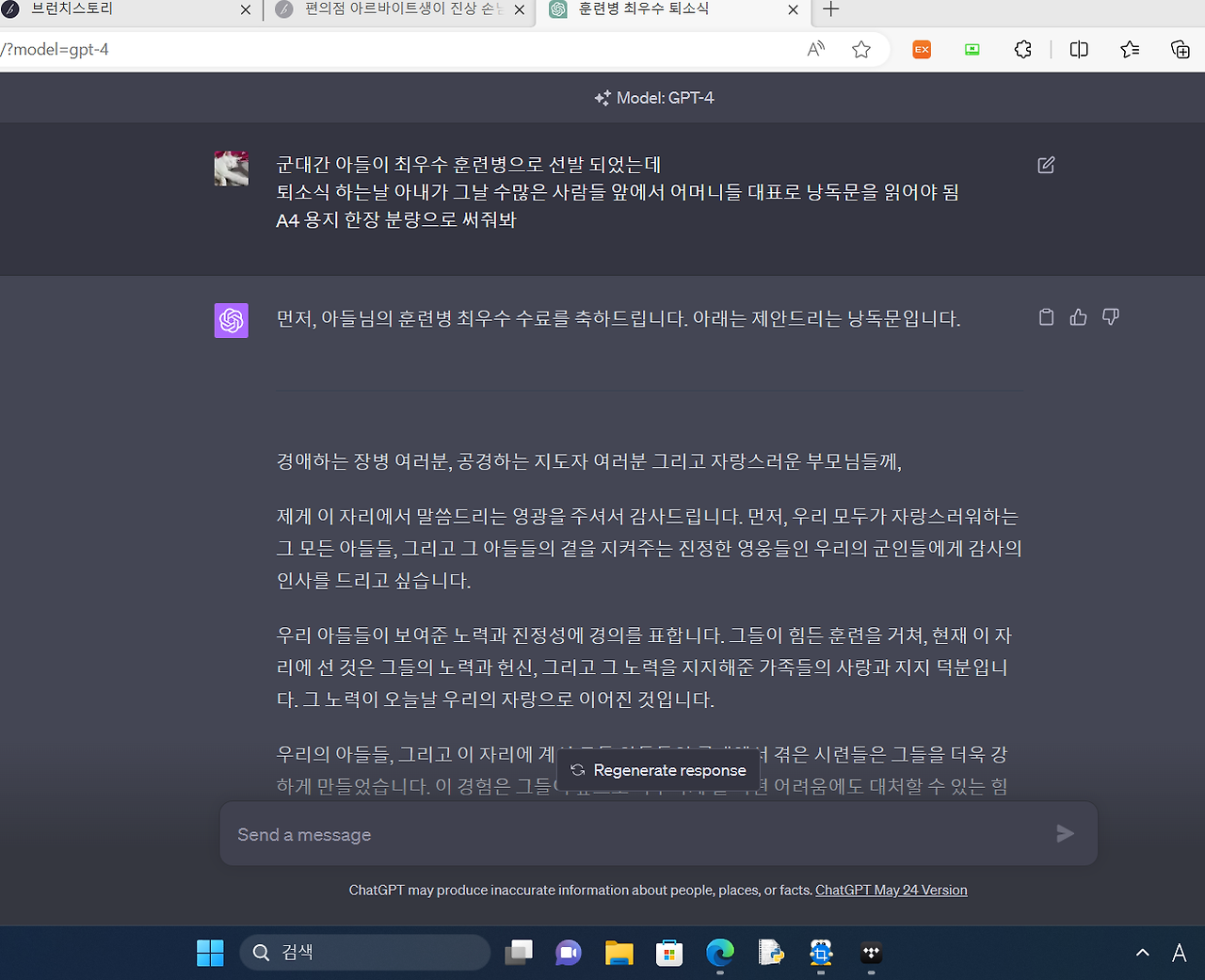 훈련소에서의 아들 소식이었다. 우리 아들, 내가 자랑스럽게 생각하며 키워온 그 아들이 훈련소에서 최우수 훈련병으로 선발되었다는 것. 그 소식을 듣고 나의 가슴은 넘치는 자랑과 행복으로 가득 찼다. 그리고 더불어 아내는 이러한 경사를 맞아 어머니들 대표로 퇴소식에서 낭독문을 읽어야 한다는 연설의 부담감도 함께 전해왔다. 군대에서 보내온 예시문 사진도 첨부되어 있었다.