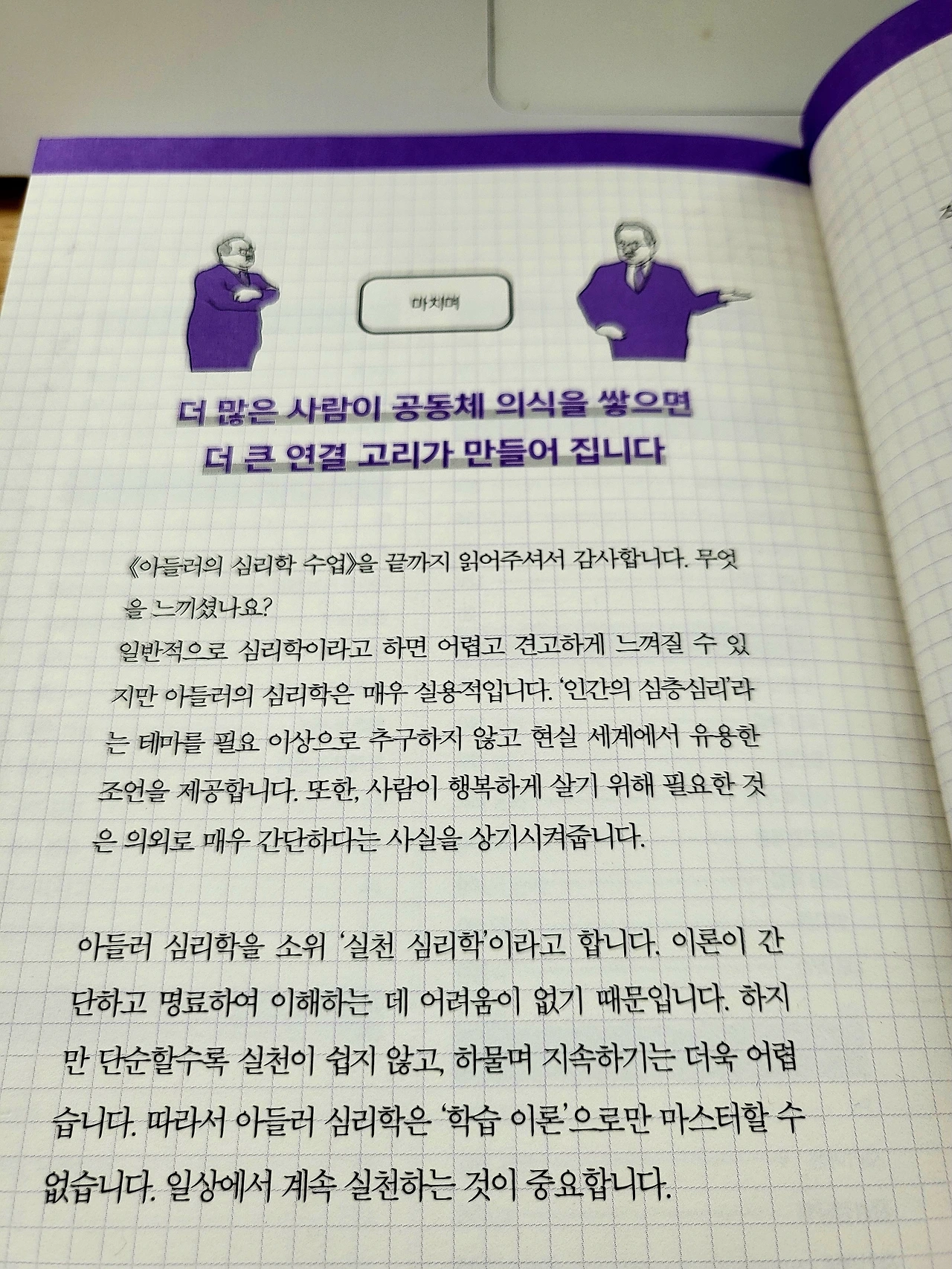 그런데 잠시 눈을 들어 서가를 살펴보니 '아들러의 심리학 수업'이라는 책이 눈에 띄었다. 알프레드 아들러, 그는 공동체 의식의 중요성을 강조한 심리학자였다. 그의 철학은 사람들이 사회와 어떻게 상호작용하는지, 그리고 이것이 어떻게 우리의 삶에 영향을 미치는지에 대한 깊은 이해를 제공한다.