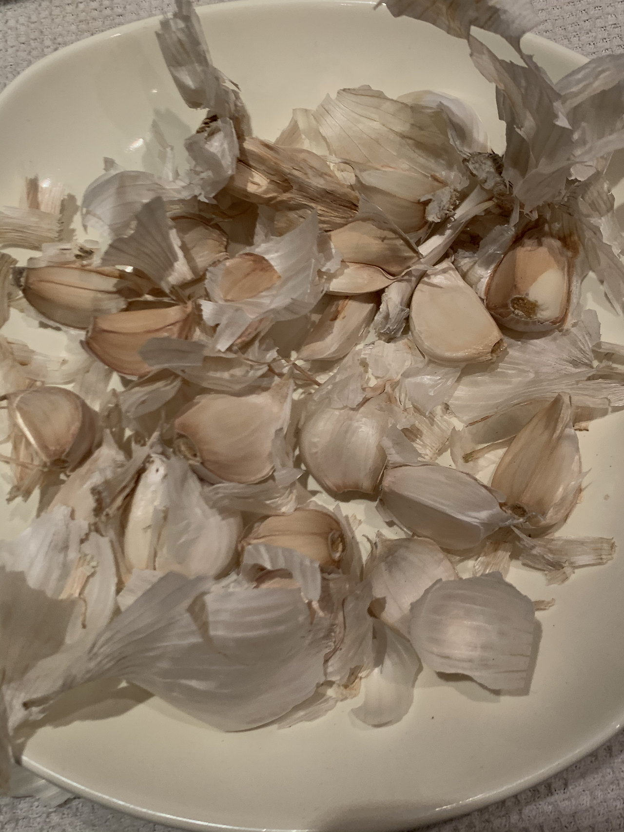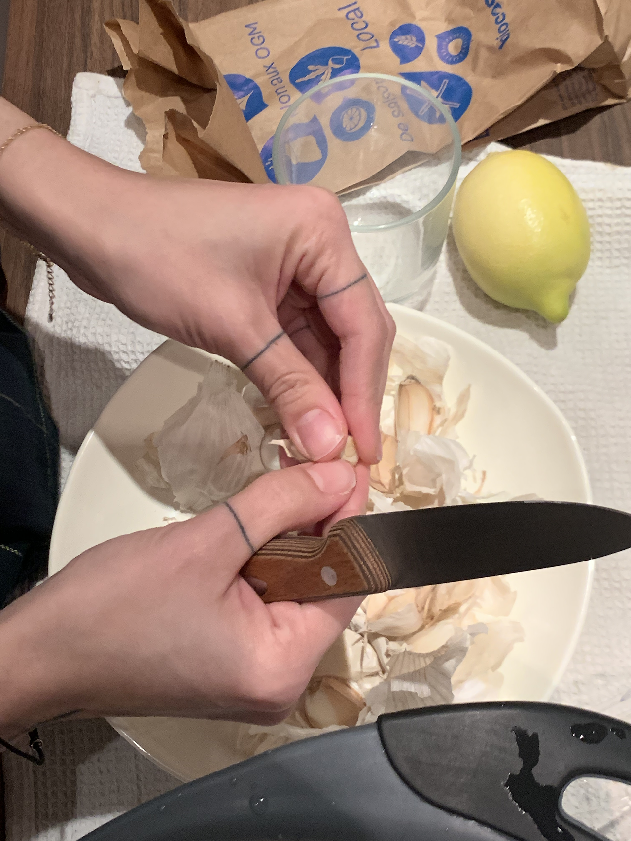 나는 샐러드와 마늘을 손질하고 테이블을 차렸다.
