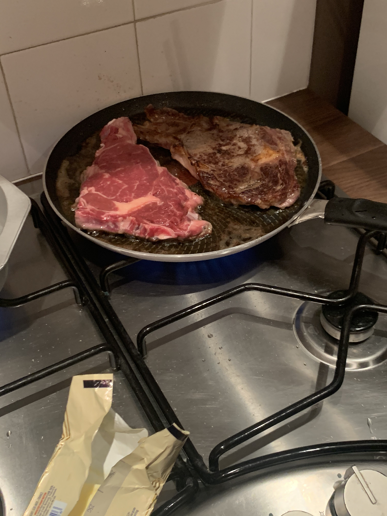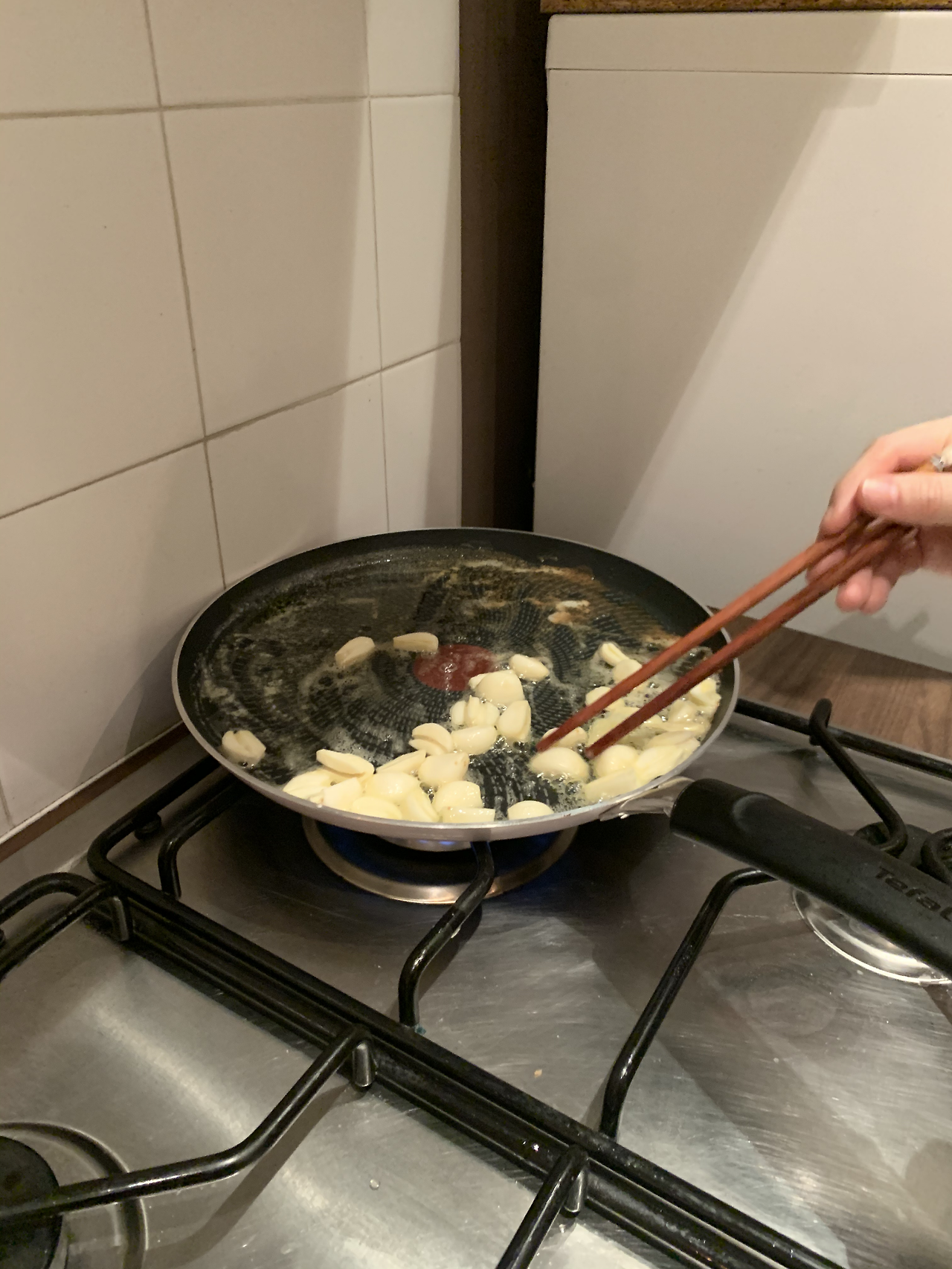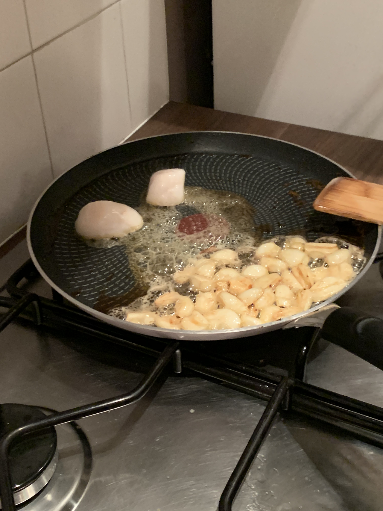 H는 관자를 손질하고 불을 켜 마늘과 버터, 그리고 관자를 구웠다.