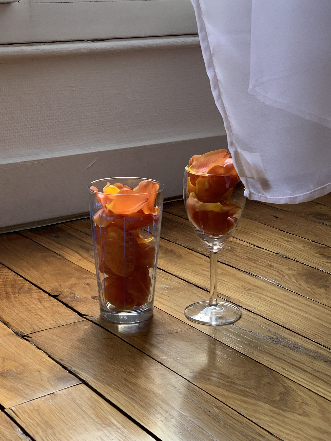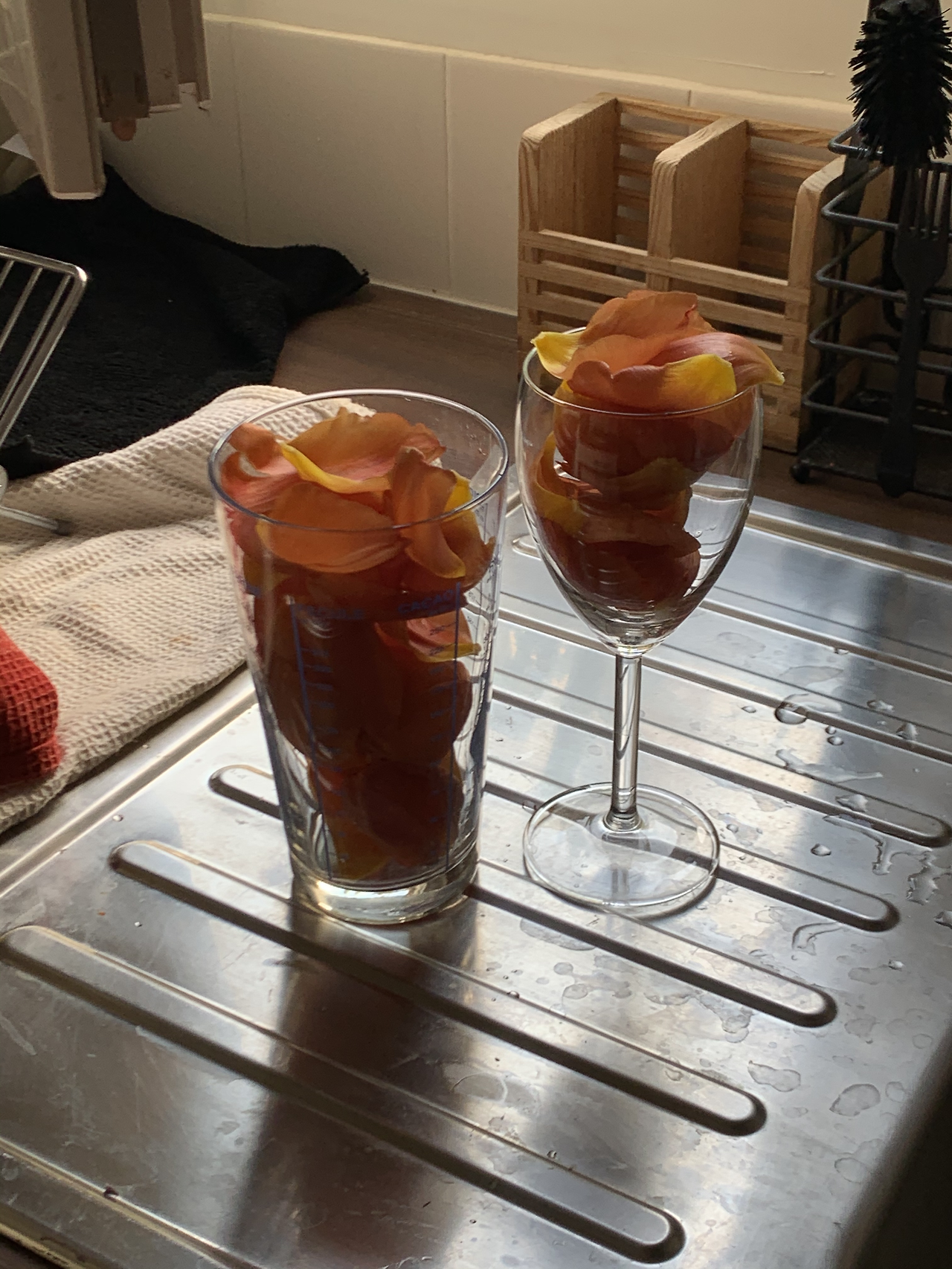 헌데 장미잎과 다르게 튤립의 꽃잎들은 아직 탱탱하고 색이 고왔다. 그래서 계량컵을 씻어 그 안에 꽃잎들을 담았다.