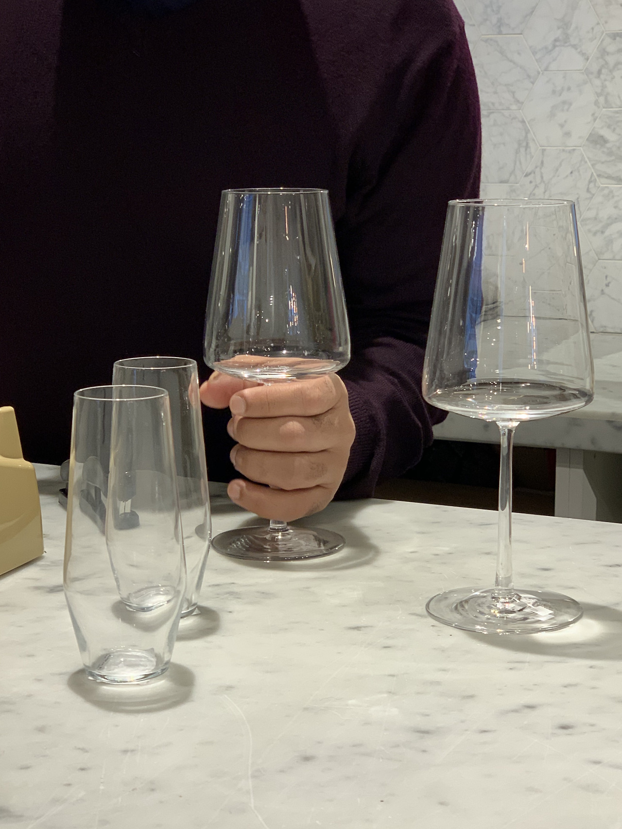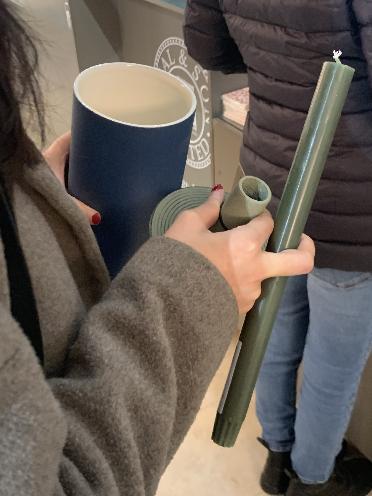 고른 것들 중 B가 구매한 것 : 맥주잔으로 딱일 유리 잔과 각진 턱이 포인트인 와인잔, 거친 듯 아닌듯한 표면의 중간에 움푹 들어간 디테일이 있는 짙은 푸른색 화병 그리고 채도가 낮은 에메랄드빛 촛대와 녹색 초.