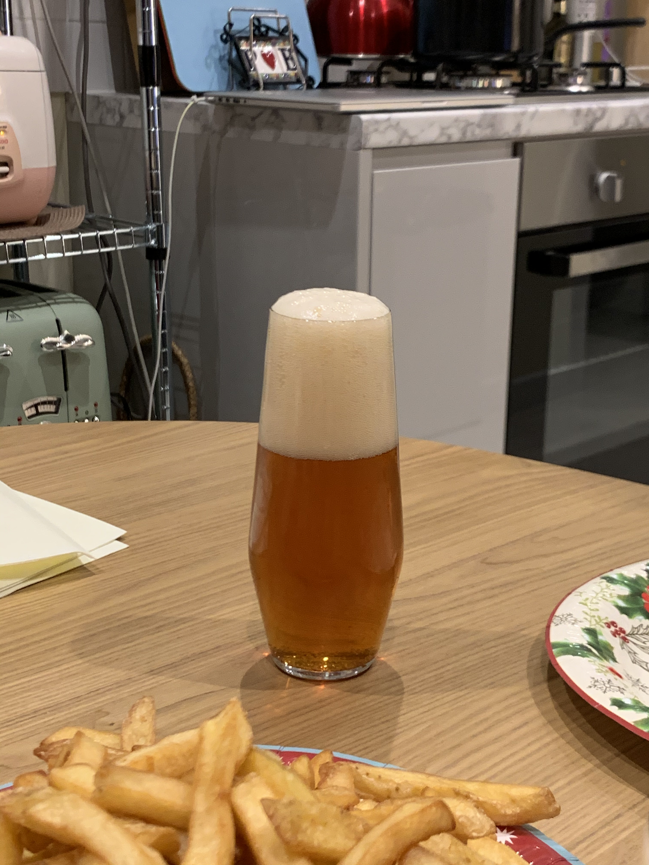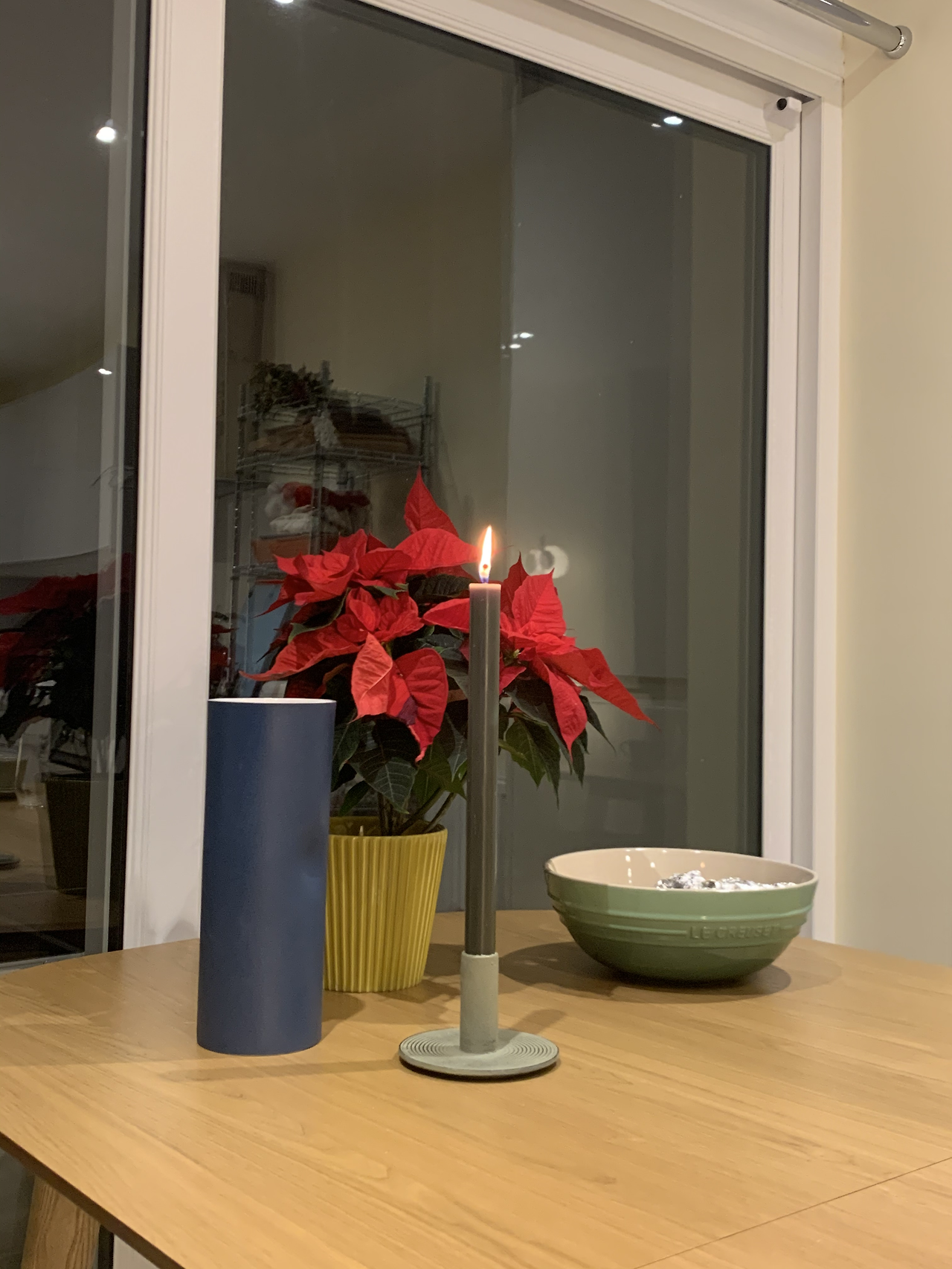 밖에서는 전혀 눈치채지 못한 내부에 나도 모르게 탄성을 뱉었다. 제일 먼저 보였던 건 런던 생활 4년 만에 처음으로 구매했다는, 거실 한편에서 빛을 밝히고 있는 크리스마스트리였고, 이윽고 색에 관심이 많아졌다던 그녀가 고른 짙은 남색의 카우치와 짙은 녹색의 식탁의자가 눈에 들어왔다. 그리고 우리가 고른 화병과 촛대를 둘 밝은 나무 컬러를 가진 모서리가 둥근 식탁도 보였다. (내가 생각하는 예의상 집의 내부 공간으론 이곳만 찍어 봤다.)