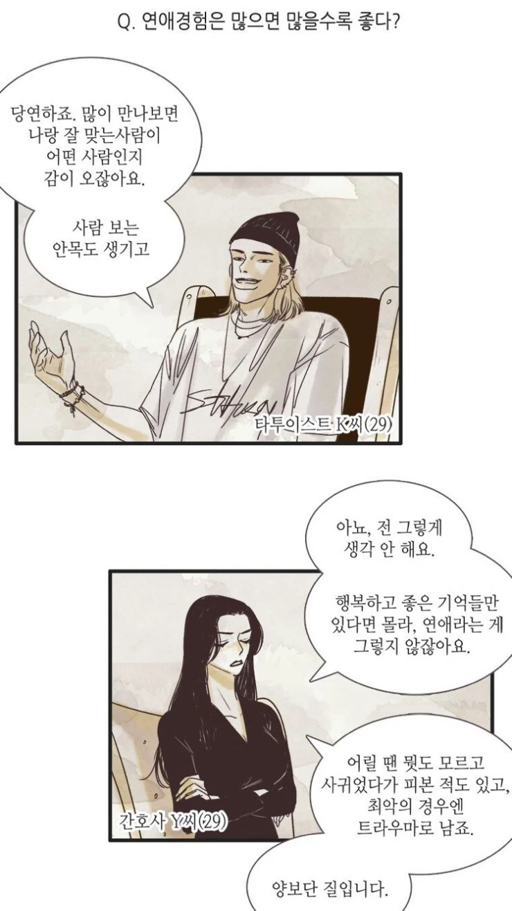 가끔 이렇게 주연, 조연 가릴 것 없이 인터뷰하는 장면이 나온다. 현실 연애의 끝판왕으로 불렸던 영화 <연애의 온도>에서도 이런 포맷이 나온다. 작중 캐릭터들의 진짜 생각이나 감정을 노골적으로 표현하게 함으로써 공감을 불러일으킬 수 있었다. 연애 경험이 많을수록 좋냐는 질문에 각기 다른 상반된 생각과 주장을 하는 나리 친구들의 대사를 삽입함으로써 어떤 게 더 나은지에 대한 판단은 독자들에게 맡긴다. 어떤 것이 정답인지는 제시하지 않는다.