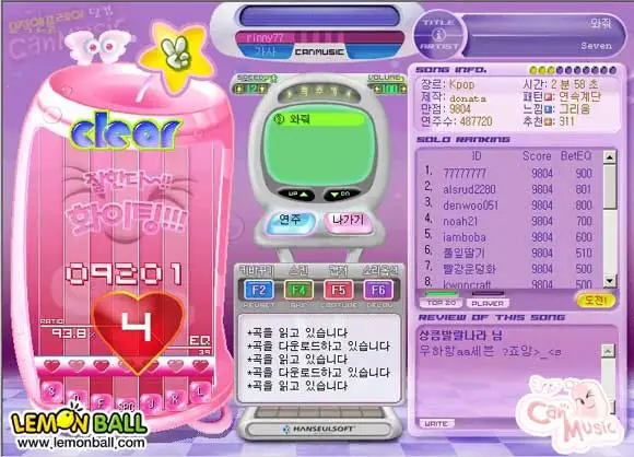 동생이 먼저 하던 걸 발견하게 된 게임. 레몬볼이라는 사이트에서 할 수 있었던 캔뮤직이다. 특히 곡 수가 많았던 것으로 기억하는데, 음악을 올리면 자동으로 악보를 만들어주는 시스템 덕분이었던 것 같다. 역시 오래하진 못했는데, 당시엔 컴퓨터를 많이 접할 수 없는 환경이라서 그랬던 것 같다. 캔뮤직을 생각하면 떠오르는 노래는 'A Little Fairy Tale'이라는 곡인데, 원곡이 무엇인지 몰라 아직까지 찾지 못하고 있다.