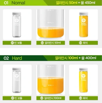 깔라만시 원액은 신맛이 매우 강하기 때문에 졸릴 때 정신 차리기 위해서가 아니라면 희석해 드시기를 권장합니다. 음용법으로는 원액과 물의 비율이 약 1 : 9 정도로 희석하는 것이 적당한 듯합니다. 신맛을 더 강하게 느끼고 싶다면 2 : 8 정도도 괜찮더군요. 저 같은 경우에는 1 : 9의 비율로 500ml를 만들어 하루 종일 조금씩 나눠 마십니다. 한 번에 많이 마신다고 모두 흡수되는 게 아니니 이렇게 나눠마시는 게 더 효율적이라고 하더군요.(어디선가 이렇게 들은 것 같습니다^^)