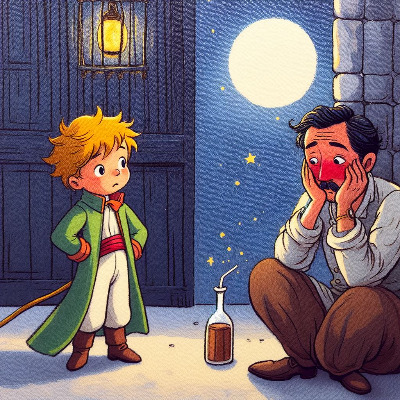 어린 왕자와 술꾼의 대화는 짧지만 강렬한 의미를 전달하는데, 술 마시는 부끄러움을 잊기 위해 술을 마신다는 순환 논법을 통해 도피와 자기 파괴적인 행위의 연결고리를 표현하고 있습니다.