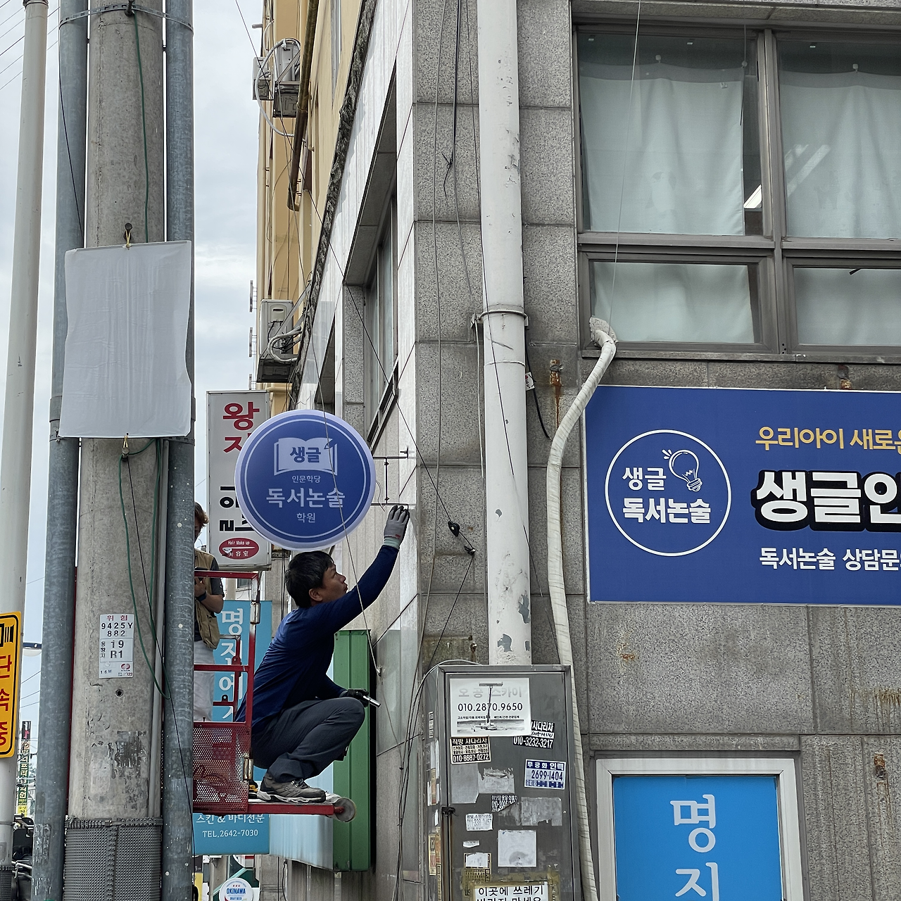 우리 학원은 큰 대로변에 있다. 학원가도 아니고 아파트 상가에 위치해 있어서, 많은 사람들이 잘 모르는 경우도 있다. 2층 창문에 크게 학원이름이 써있긴 하지만, 따로 큰 간판은 없다. 이번에 저녁에도 불이 들어오는 동그란 원형 간판을 설치하기로 했다.