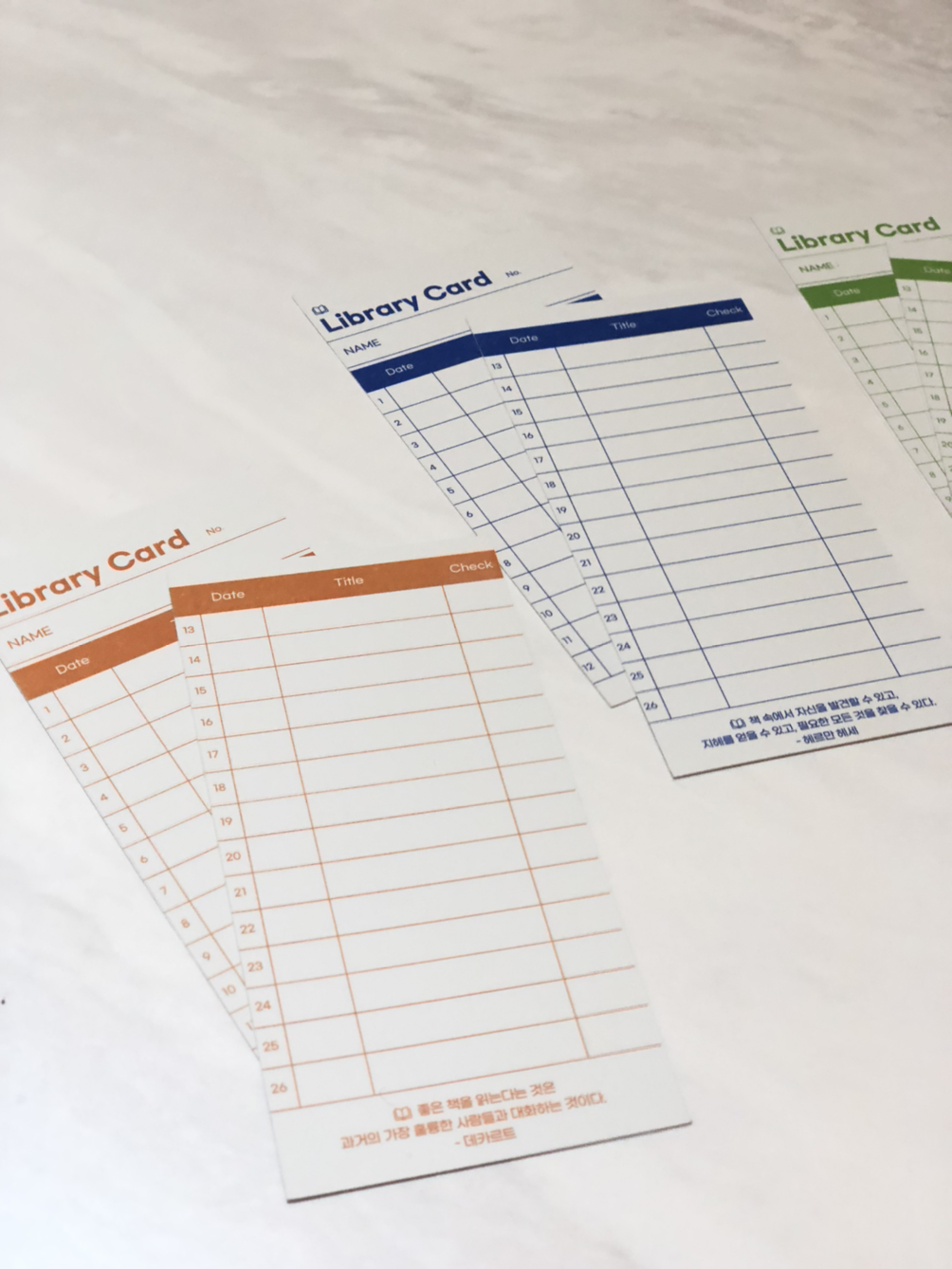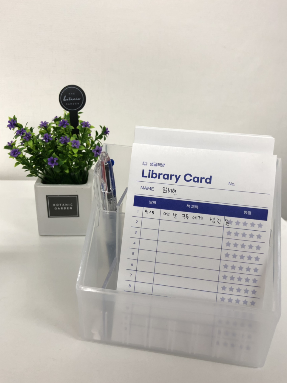 학원에 비치된 도서들을 빌려가고 평점을 적을 수 있는, 도서대출카드를 새로 만들었다.